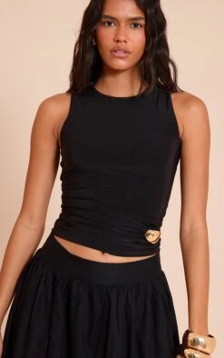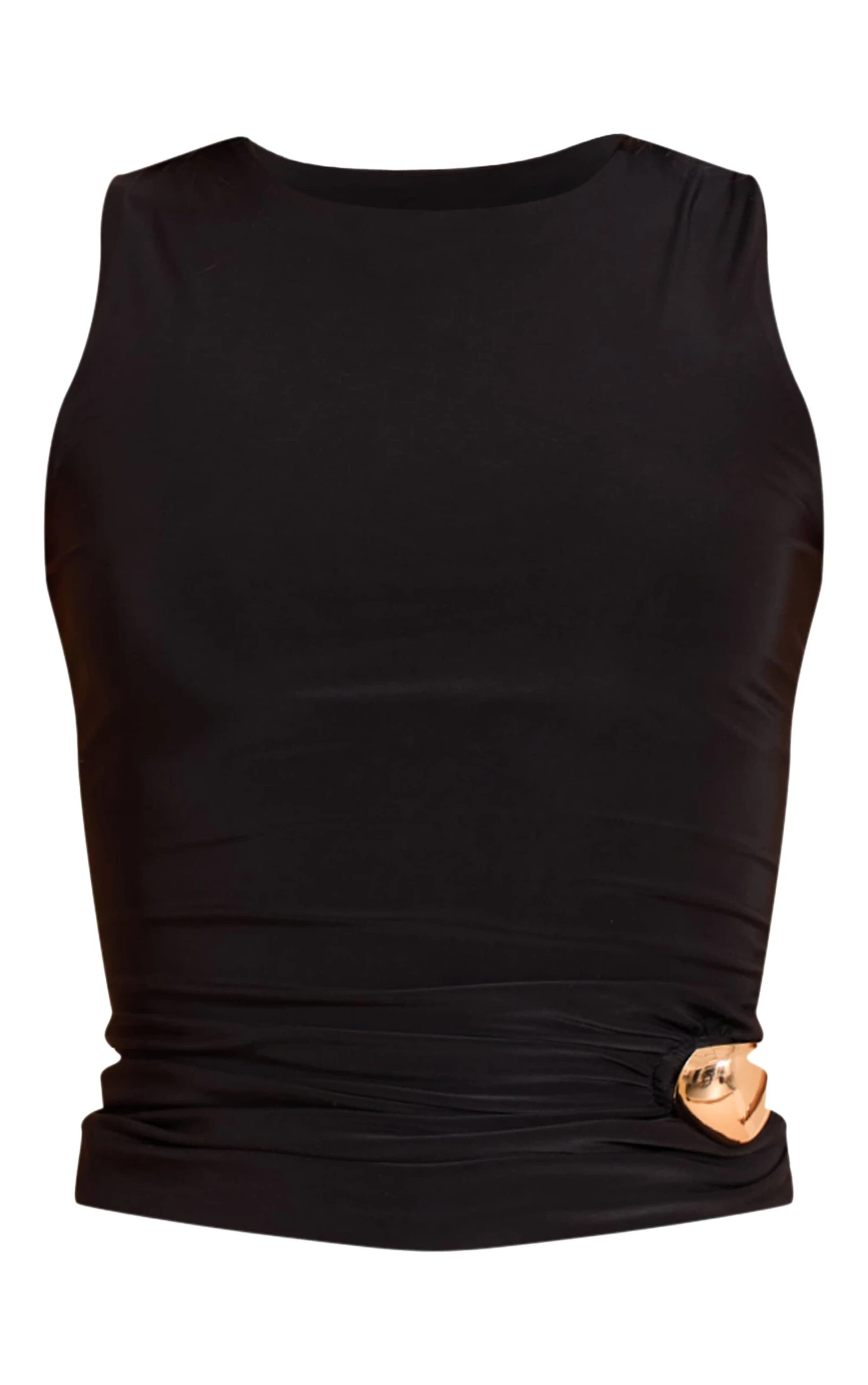 Introduce bold minimalism with this black slinky sleeveless trim detail top, a versatile piece for any wardrobe. Brought to you in a black slinky jersey fabric with contrast trim and a body-skimming silhouette, it’s both sleek and wearable. Pair with a maxi skirt and statement hoops for a refined casual edit.