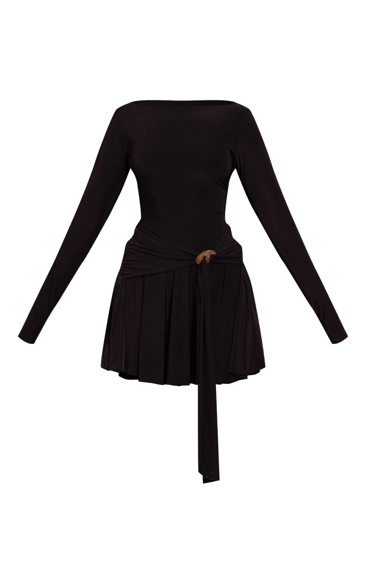 Command attention with a sleek vision for evening. The black slinky trim belt detail mini shift dress offers an artful aesthetic, featuring an elegant boat neckline and long, smooth sleeves that shape a confident upper profile. A distinctive buckle and ruched belt detail perfectly cinch the waist, flowing into a chic, floaty mini skirt that moves with every step. Elevate this statement piece with sharp black heels and a selection of discerning gold jewelry, creating an unforgettable, effortlessly confident evening aesthetic.