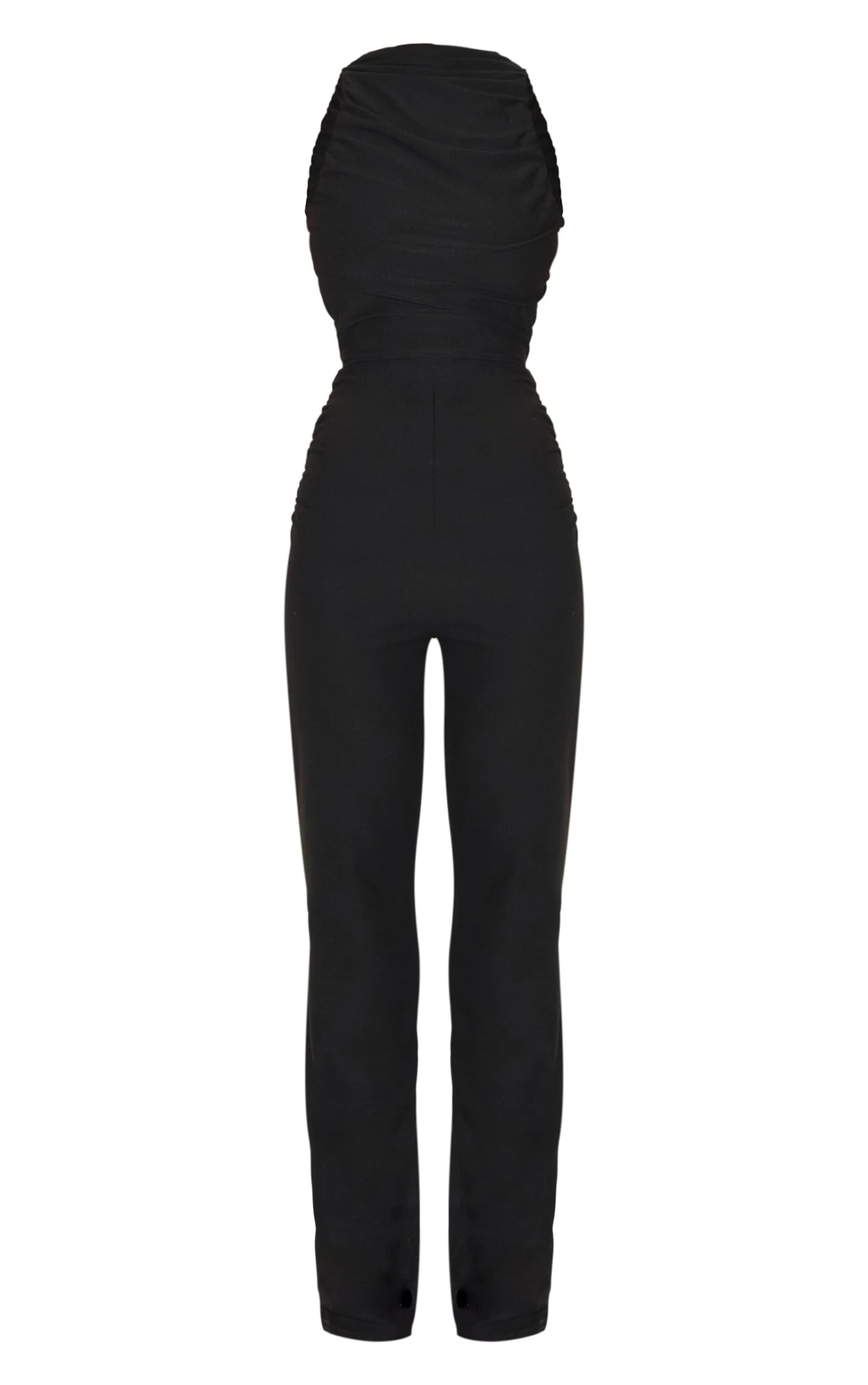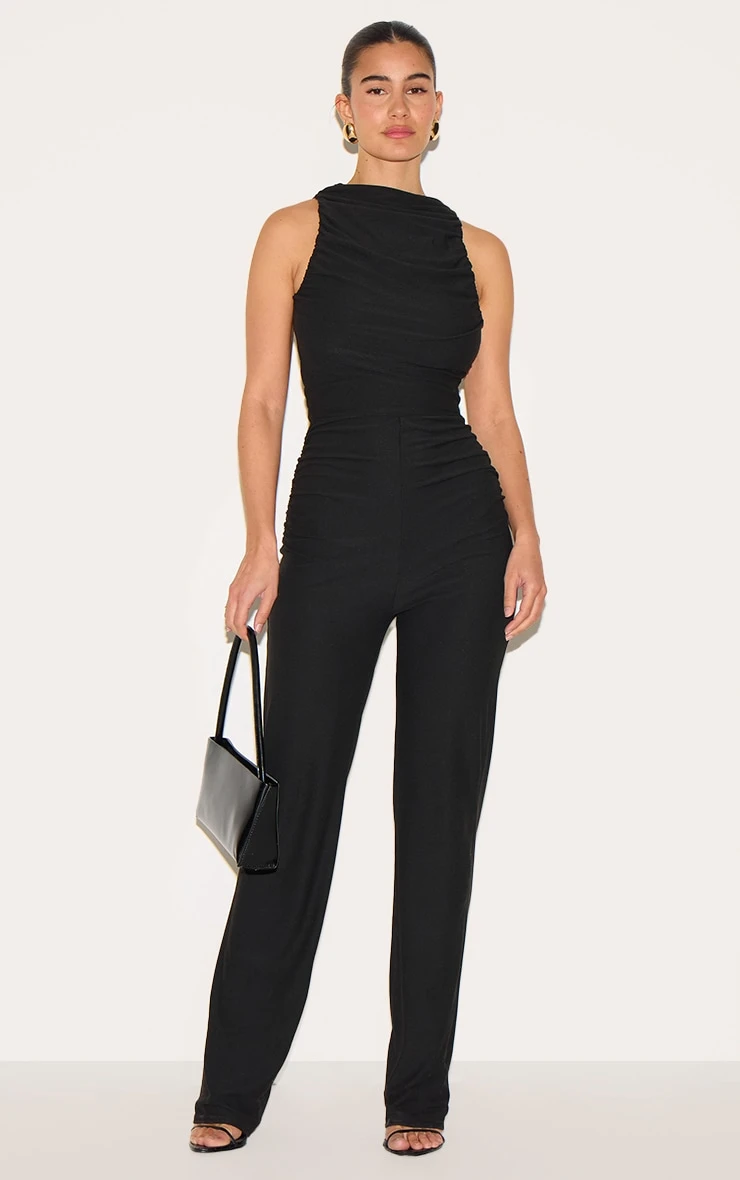 Make weekend styling look effortlessly chic in this black soft touch ruched straight leg jumpsuit. Made from a black soft touch material with a ruched design and a straight leg fit. Style this black jumpsuit with heels and simple accessories to elevate the look.