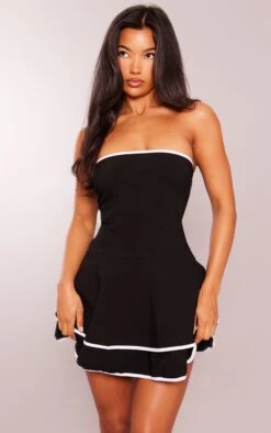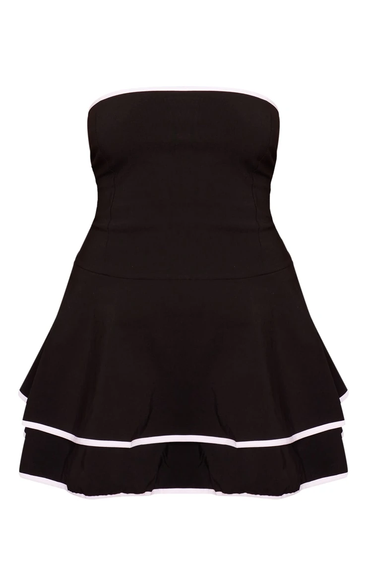 Keep it chic in this black stretch woven contrast tiered shift dress. Brought to you in black stretch fabric, this dress has contrast binding, a bandeau neckline and a tiered mini skirt. Wear it with subtle gold earrings and black barely-there stiletto heels for a look we’re loving right now.