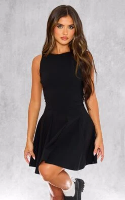 Consider this your shortcut to minimalist chic. This black shift dress offers a masterclass in understated sophistication, crafted from a stretch woven fabric that holds its shape beautifully. The racer neckline lends a contemporary edge, while the precise pleating adds subtle texture and movement. The result? A piece that effortlessly transitions from daytime meetings to evening engagements. Elevate the look with a sculptural cuff from our jewelry collection for a truly refined statement.