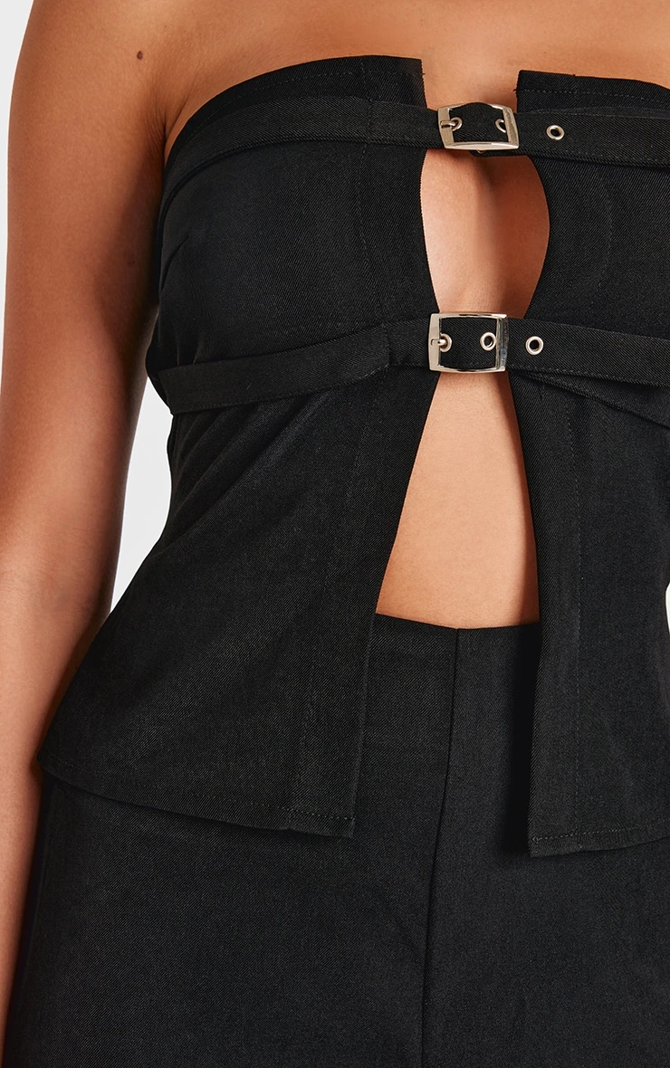 The bandeau jumpsuit, reimagined. This piece offers a study in sartorial precision, crafted in a black woven fabric with a structured silhouette. The bandeau neckline provides a clean, minimalist foundation, while the тонкое (thin) woven belt cinches the waist, defining the form without compromising the effortless line. Consider this jumpsuit your go-to for a confident evening statement. Finish the look with a delicate chain from our jewelry collection for added edge.