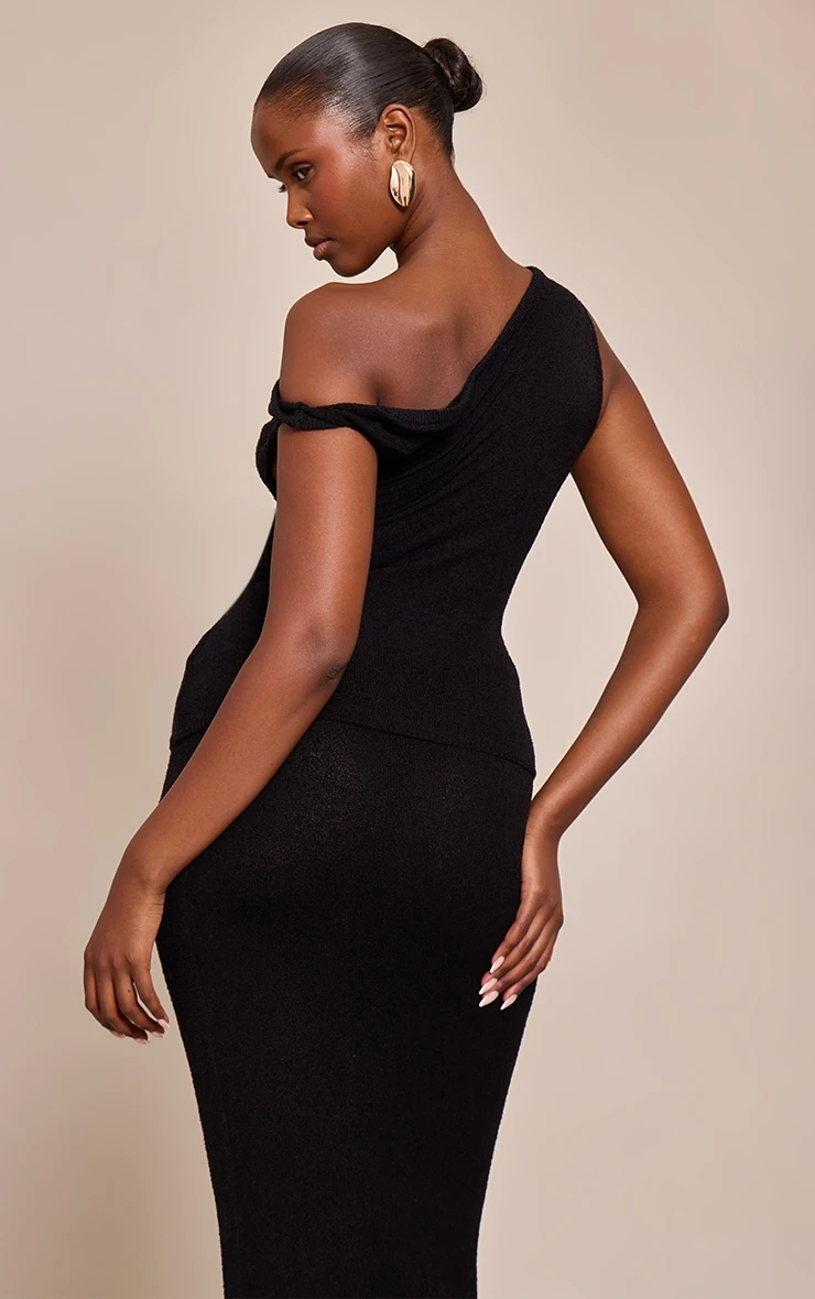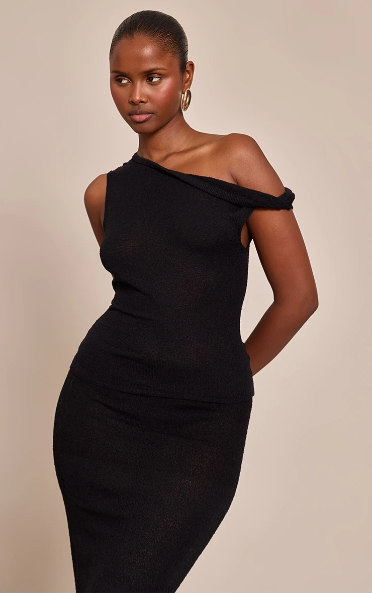 The black towelling fine knit asymmetric top brings modern texture and architectural design to casual styling. Made from a fine knit with a soft towelling finish, it features an asymmetric neckline that adds interest and edge. Its fitted silhouette makes it versatile for layering or wearing as a statement piece. Team with the matching maxi skirt for an effortless evening look, or dress it down with high-waisted jeans and loafers.