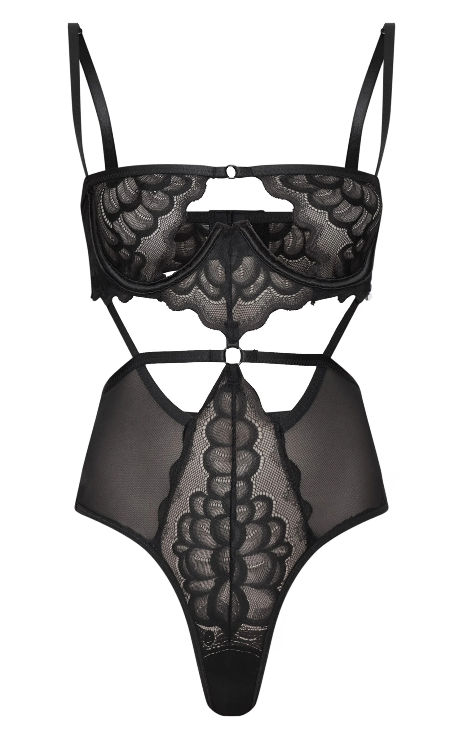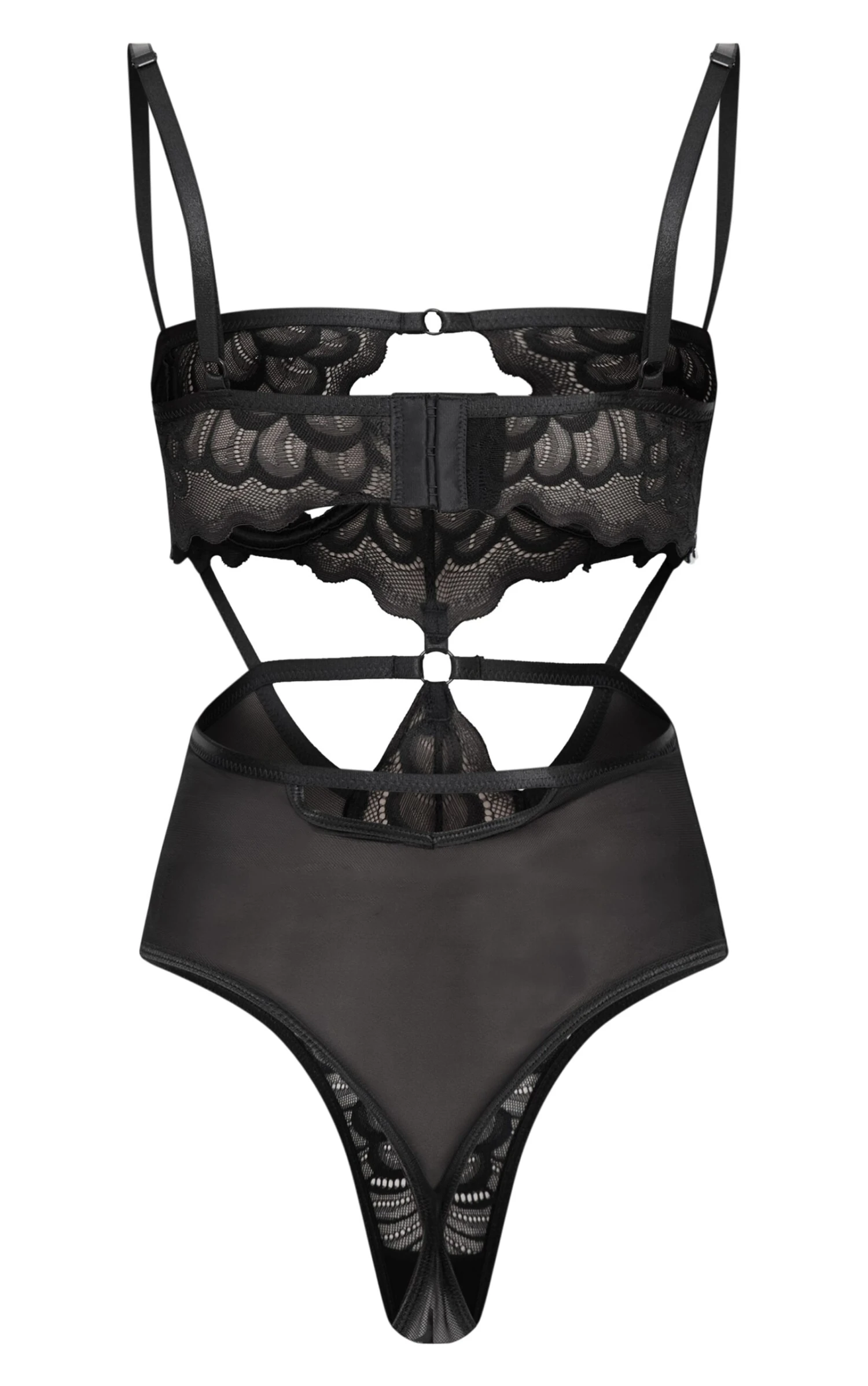 Elevate your after-dark edit with this black lace body. Delicately crafted from intricate lace, the underwired cups offer subtle support, while the strategically placed cut-outs add a contemporary edge. Adjustable straps ensure a custom fit. Style it with tailored pants from our bottoms collection for a refined, yet confident evening look.