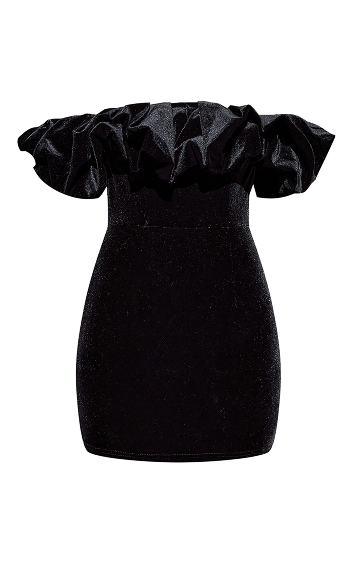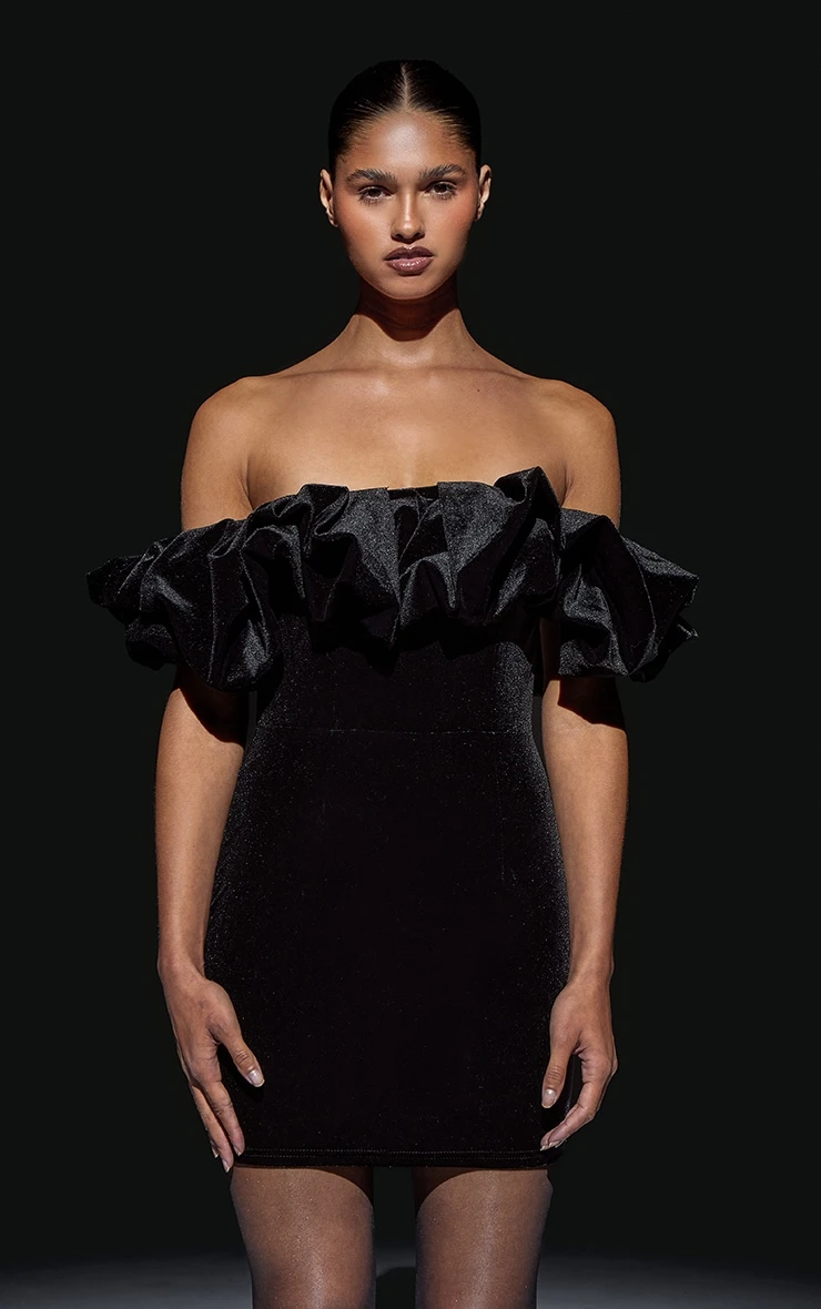 Elevate your after-dark edit with this black velvet bodycon dress. Crafted from plush velvet, the bardot neckline is accented with a subtle ruffle detail, offering a considered take on evening dressing. The bodycon silhouette ensures a streamlined profile. Style with a delicate chain from our jewelry collection to complete the look.