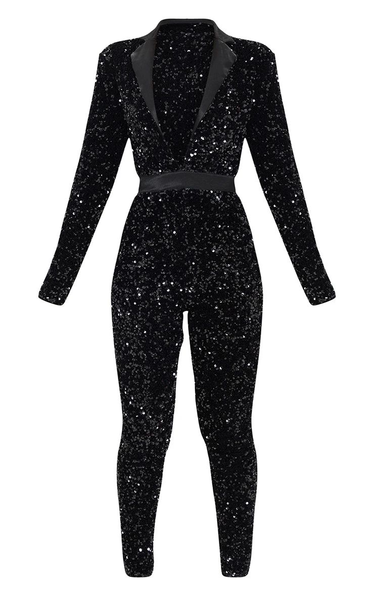 Velvet gets a modern update with this black sequin jumpsuit. The plush texture contrasts with the sharp tailoring and daring plunge front, creating a balanced silhouette that commands attention. Long sleeves add a touch of refinement, making this piece ideal for evenings that demand a considered statement. Style it with a chain-detail clutch from our accessories collection for a look that’s both confident and effortlessly chic.