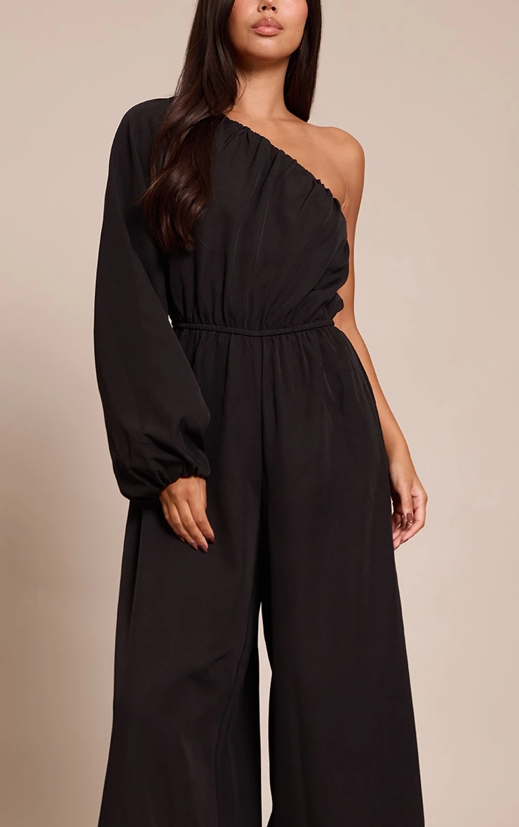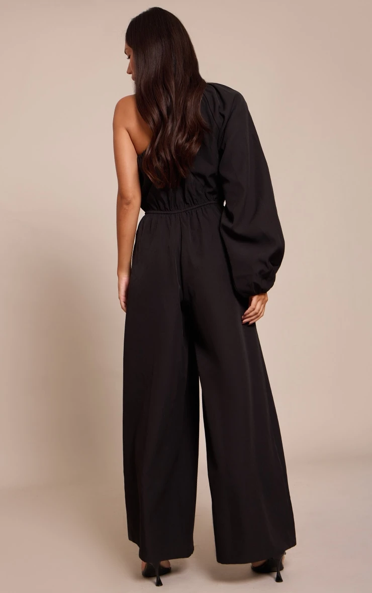 Stay sleek in the black woven asymmetric cinched waist jumpsuit. Made from a black woven material, it features an asymmetric neckline, cinched waist, and wide leg silhouette for modern elegance. Pair with kitten heels and gold earrings for an effortlessly chic finish.
