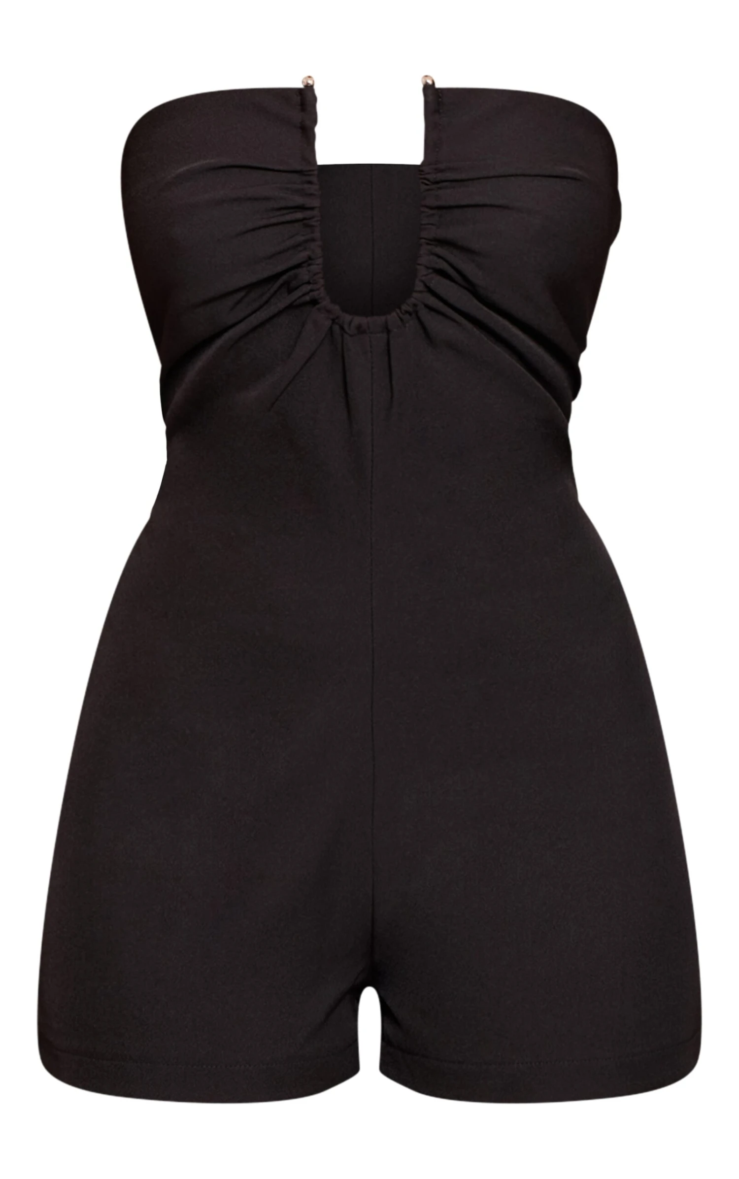Own the evening in a silhouette designed for definitive impact. The black woven bandeau tailored romper presents a confident aesthetic with its sharp bandeau neckline, featuring a distinctive ruched U-plunge detail that adds an artful edge. Its tailored shorts create a sleek, structured profile, perfect for an elevated after-dark look. Complete this confident statement with some refined black heels and a subtle gold ring for an ensemble that speaks volumes.