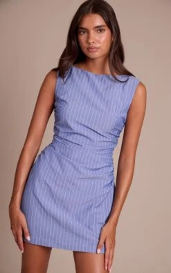 The blue pinstripe ruched detail bodycon dress combines classic tailoring with a modern edge. Crafted from a stretch woven fabric, it hugs the figure with ruched side seams that create flattering dimension. The sharp pinstripe pattern nods to power suiting, while the fitted silhouette keeps it fresh and feminine. Designed to sit mid-thigh, it’s a striking piece for both desk-to-dinner styling. Pair with heeled mules and a sleek tote for the office, then switch to stilettos and a leather clutch for after-dark appeal.