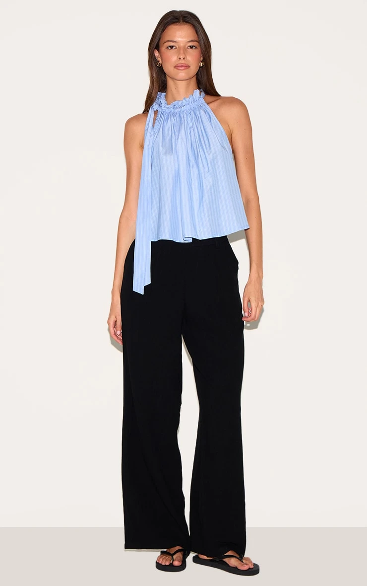Feel confident in this blue pinstripe ruched tie neck top. Brought to you in a blue material with a pinstripe design, a ruched detail and a tie neck detailing. Finish the look with some wide leg pants and a pair of sandals to elevate the look even further.