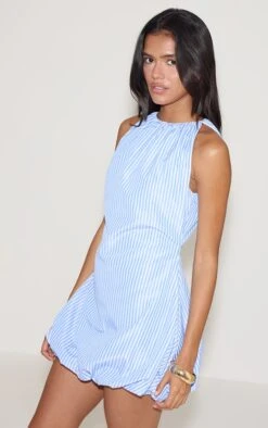 Add a touch of luxe to your seasonal look in this blue striped boat neck puffball dress. Featuring bright striped fabric, this dress has a feminine boat neckline and a fashion-forward puffball design. Keep it cute by teaming it with flat sandals and understated earrings.