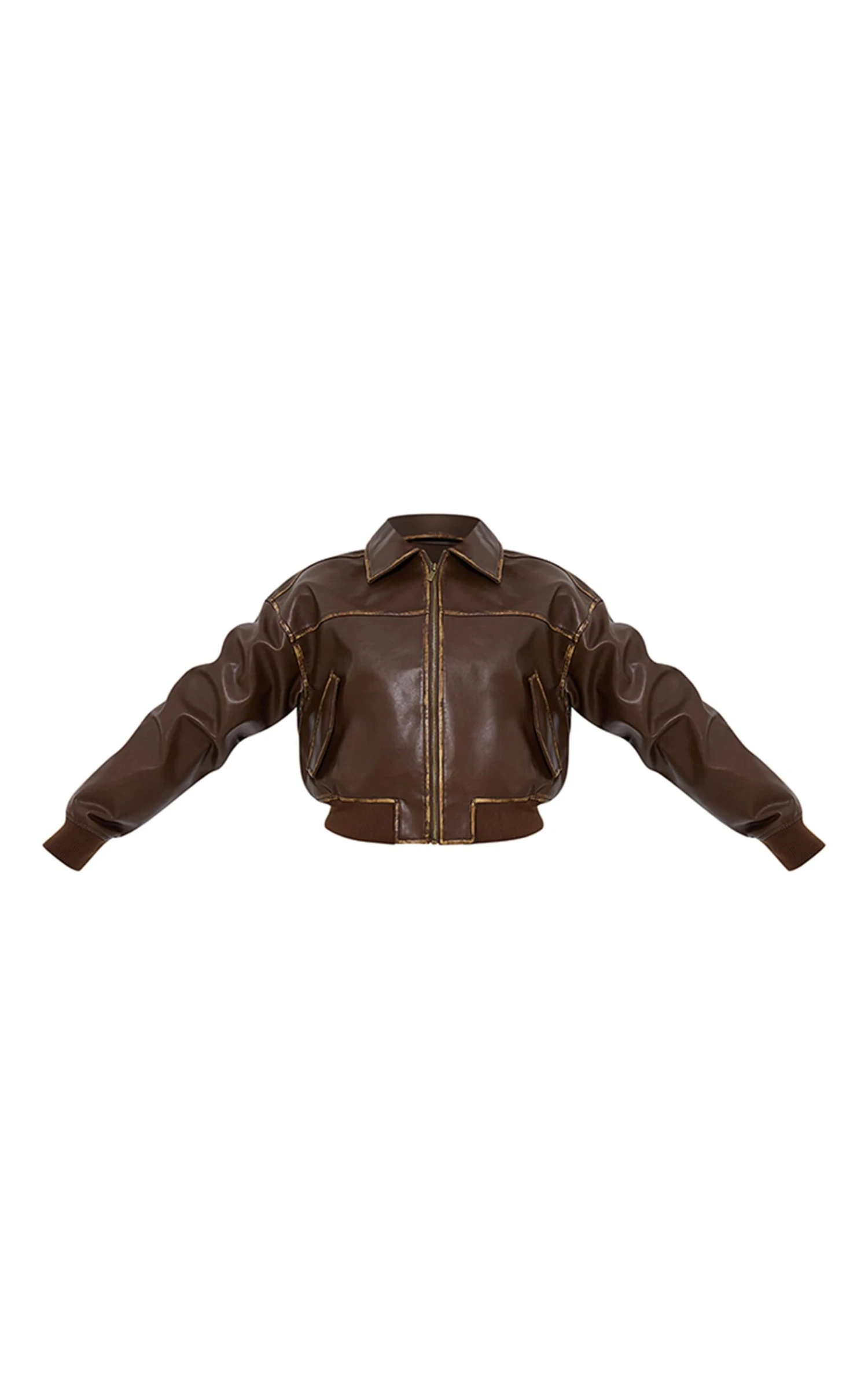 This faux leather bomber offers a modern take on a classic silhouette, imbued with a subtle rebellious streak. The bleach detail adds a unique, almost artisanal touch to the rich brown hue, elevating the cropped cut. Crafted from quality faux leather, it’s a versatile layering piece that provides both structure and a touch of edgy sophistication. For a contemporary ensemble, pair it with high-waisted tailored pants from our bottoms collection; think wide-leg styles in neutral tones to balance the cropped length and amplify the jacket’s cool factor.