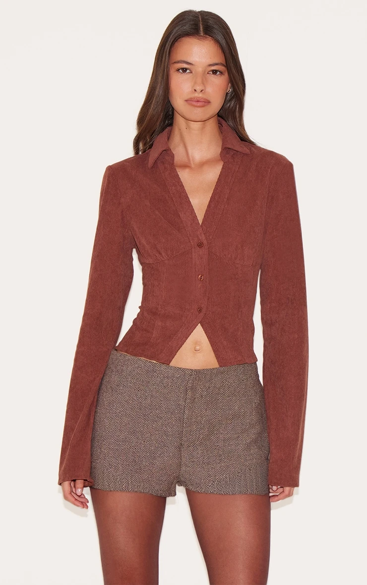 Define your look with intentional structure. The brown corduroy fitted shirt cuts a precise silhouette, shaped with a sharp collar leading to a deep V-neckline and value-through front. Artful seams enhance the fitted bodice, creating a defined waist before the hem curves high at the front, completed by long sleeves. Team this knowing piece with high-waisted tailored pants or a sharp mini skirt for an effortlessly pulled-together aesthetic.