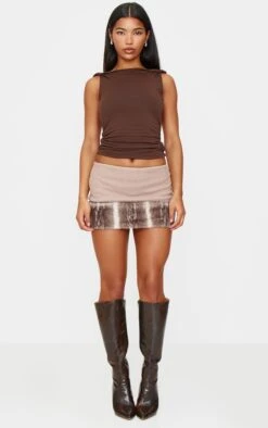 This season’s muse is channeling a certain off-duty cool. The brown micro mini skirt reimagined in a wool-look fabrication is trimmed with a tactile faux fur that adds a touch of considered edge to your after-dark edit. The textural contrast elevates this classic silhouette, making it a versatile addition to your wardrobe. Style it with chunky knitwear and tights for a daytime meeting, or with a cropped jacket and statement jewelry for an evening out. For a seamless transition into cooler weather, we suggest pairing with a knitted top and high-waisted tailored pants from our bottoms selection.