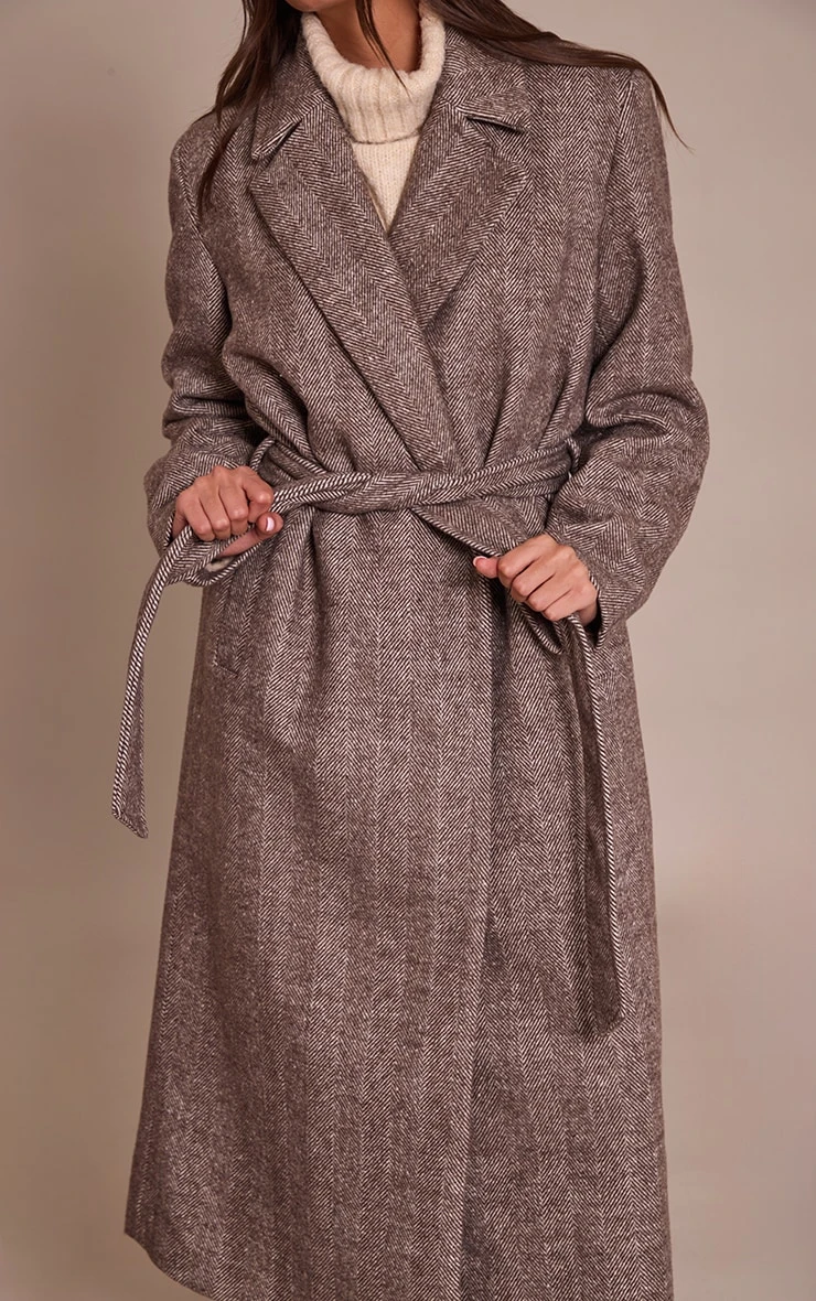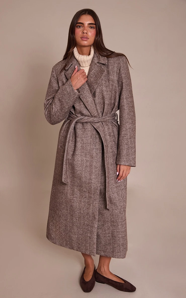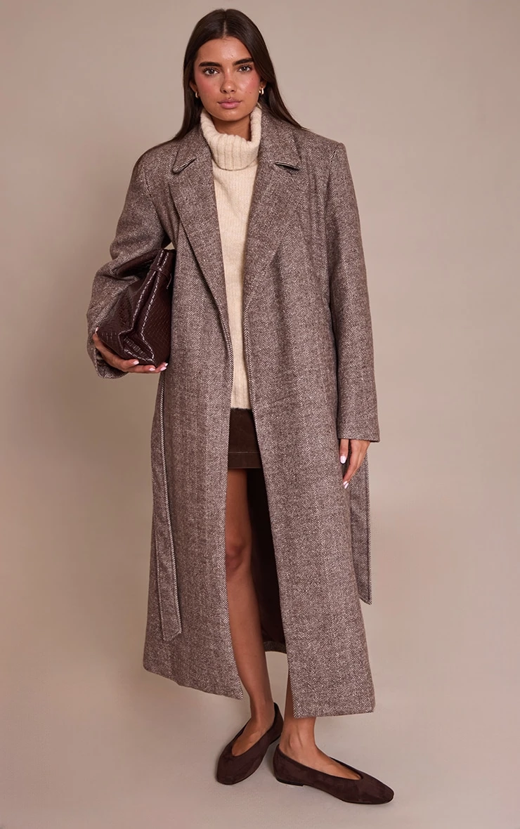 Classic meets contemporary in the brown herringbone tie waist maxi coat. Crafted in herringbone fabric with a sweeping silhouette, it’s timeless outerwear with a modern cinched waist. Style with tailored pants and loafers for weekday chic or drape over a knit dress with boots for evening sophistication.