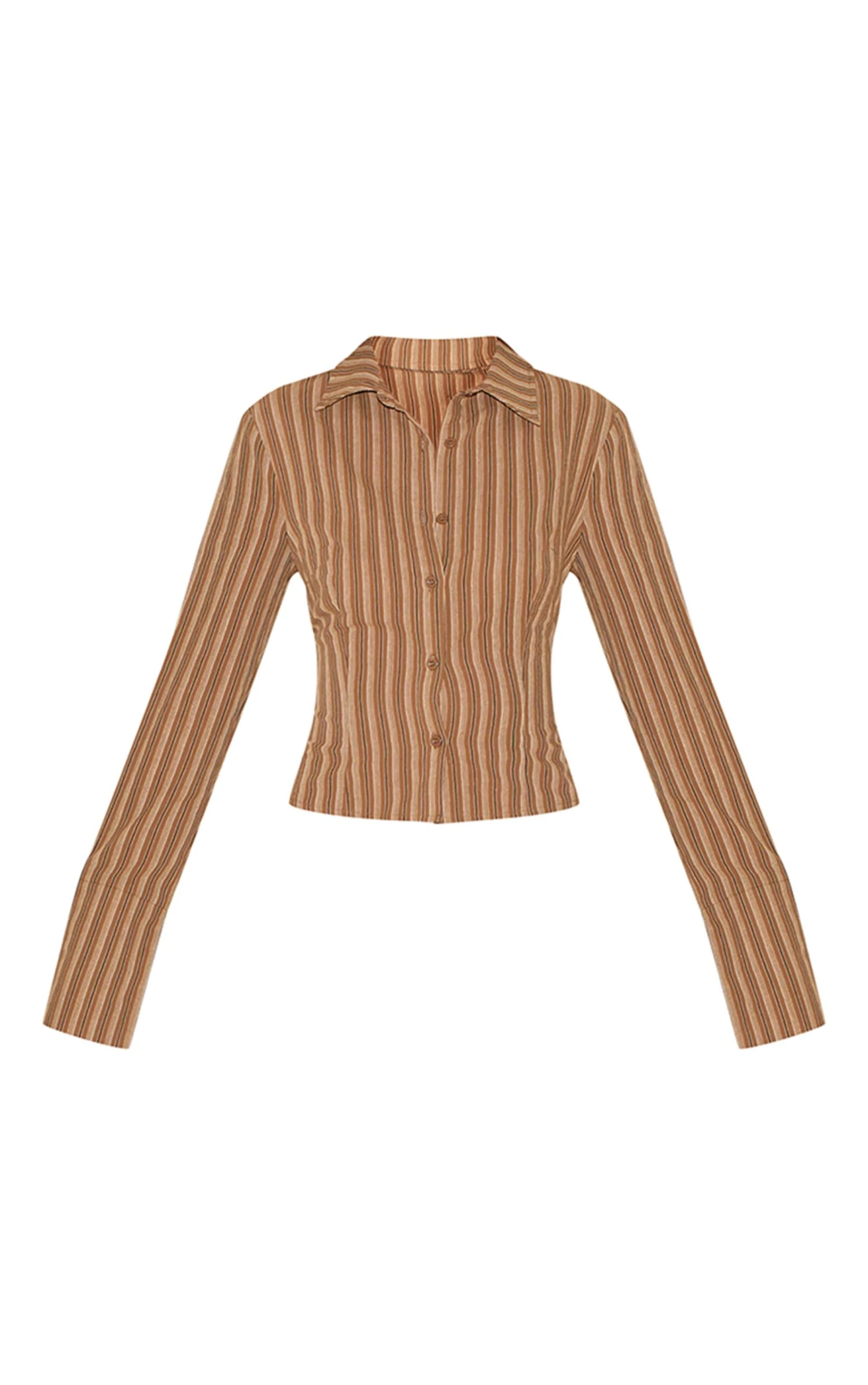 Channel new season trends into your wardrobe with this brown pinstripe fitted shirt. Made from a brown hue material with a pinstripe design, a value through fastening and a fitted style. Pair this brown shirt with the matching skirt, loafers and an oversized clutch for a look made to match your aesthetic.