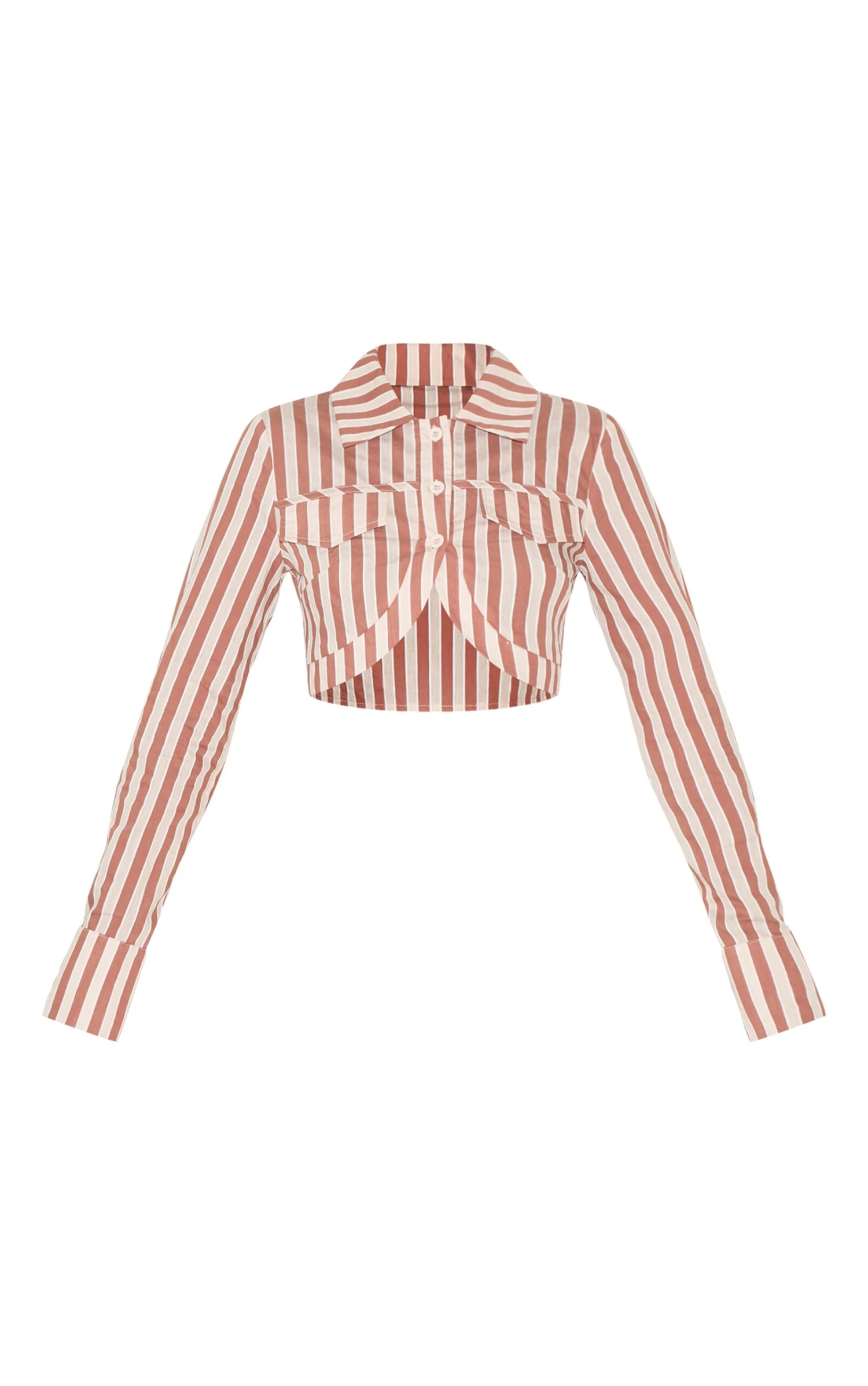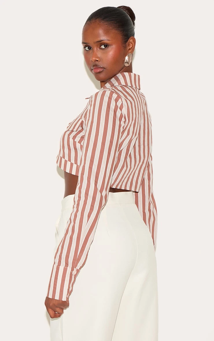 Made from a brown material with a striped design a curved hem and a cropped length. Keep it chic and pair this brown striped curved hem cropped shirt with some tailored wide leg pants and your go-to slingback court heels for a statement finish.