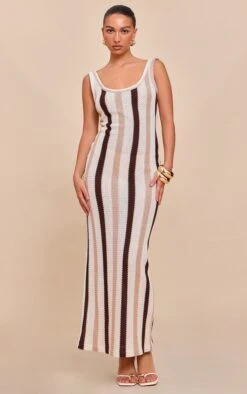 Level up your everyday with this brown striped textured scoop neck maxi dress. Made from a brown striped textured material with a relaxed maxi fit and scoop neckline. Style with heeled sandals and gold earrings for an easy day to night look.