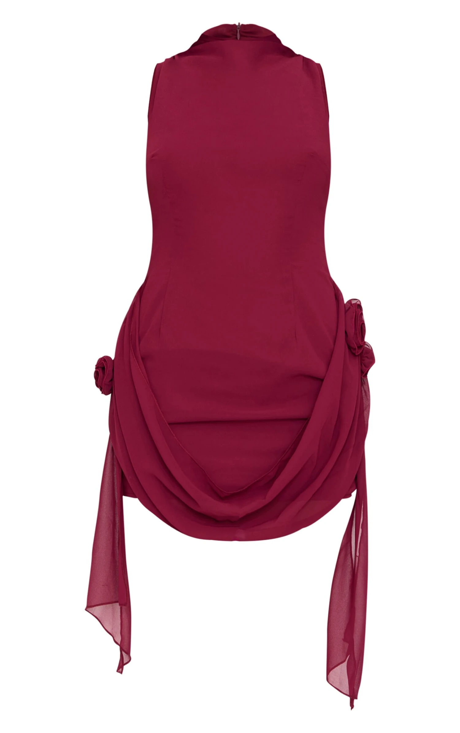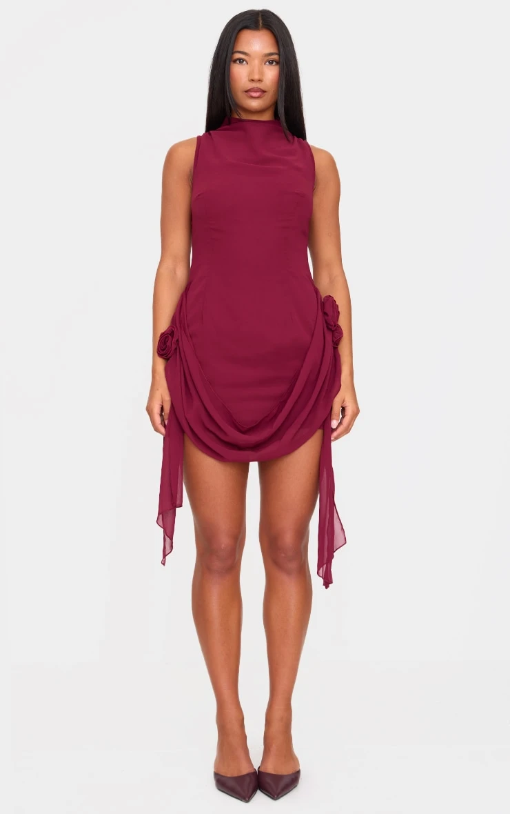 Consider this your style compass for navigating after-dark affairs. Crafted from a rich burgundy chiffon, this mini dress offers an elevated take on evening dressing. Note the elegantly draped boat neckline, a considered detail that frames the décolletage with understated allure. The mini length makes it ideal for showcasing statement footwear. Style with a sculptural clutch from our accessories collection for a modern approach to occasion dressing.