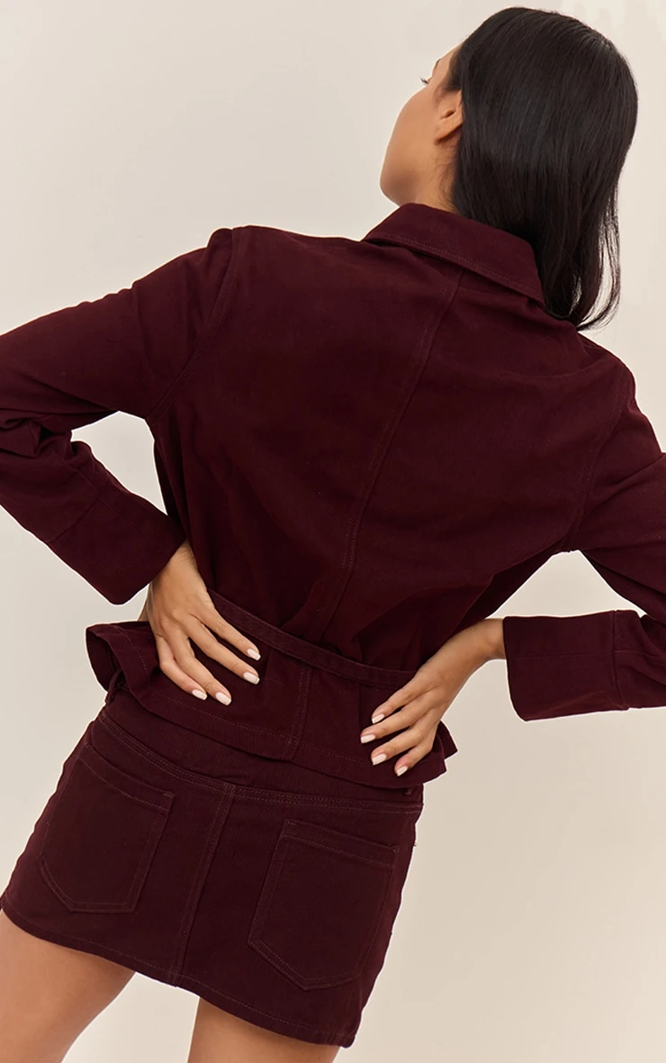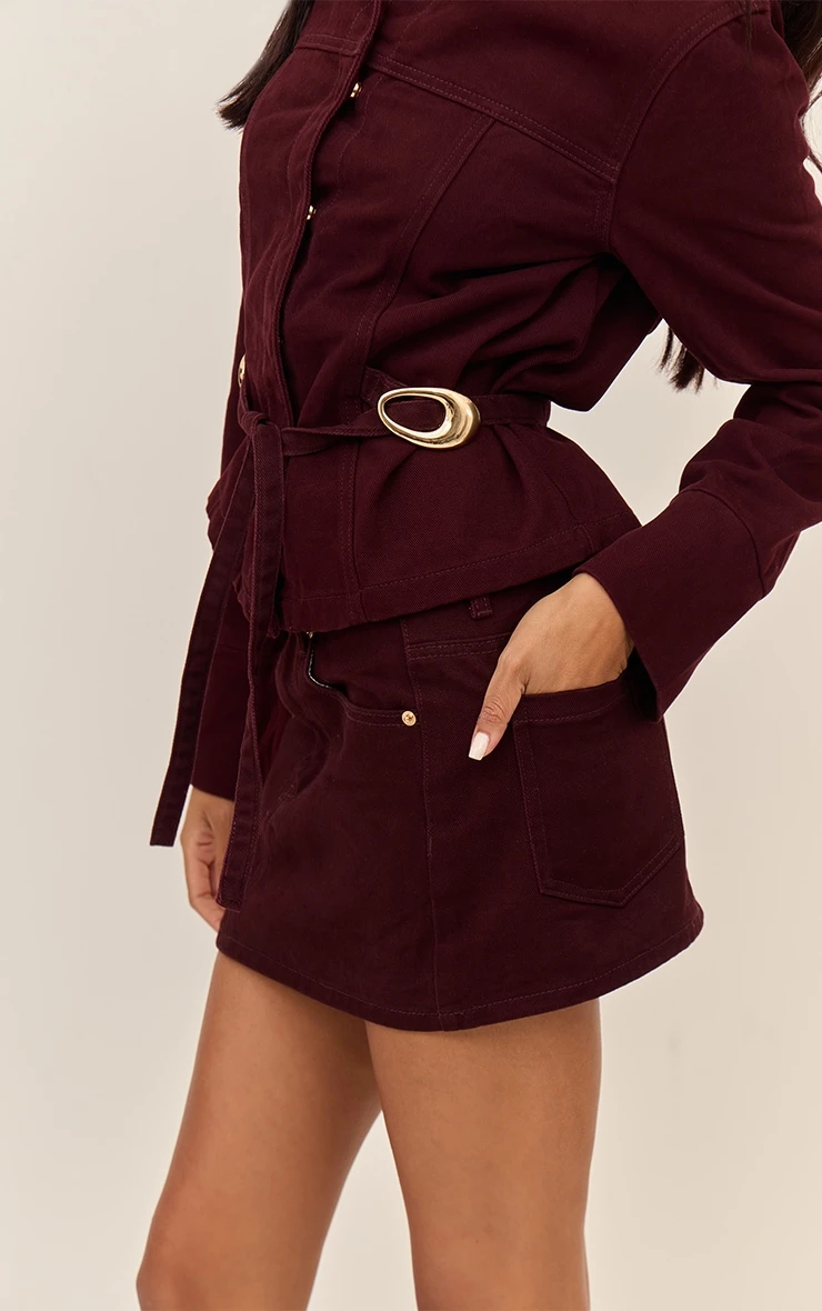 Stay sleek in the burgundy concealed placket crop belted denim jacket. Made from a burgundy denim material, it features a concealed placket, cropped cut, and a belted waist. Pair with the matching denim skirt, kitten heels and gold earrings for an effortlessly chic finish.