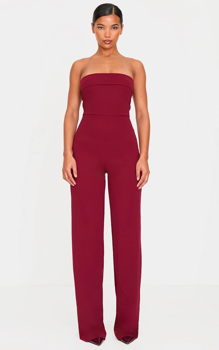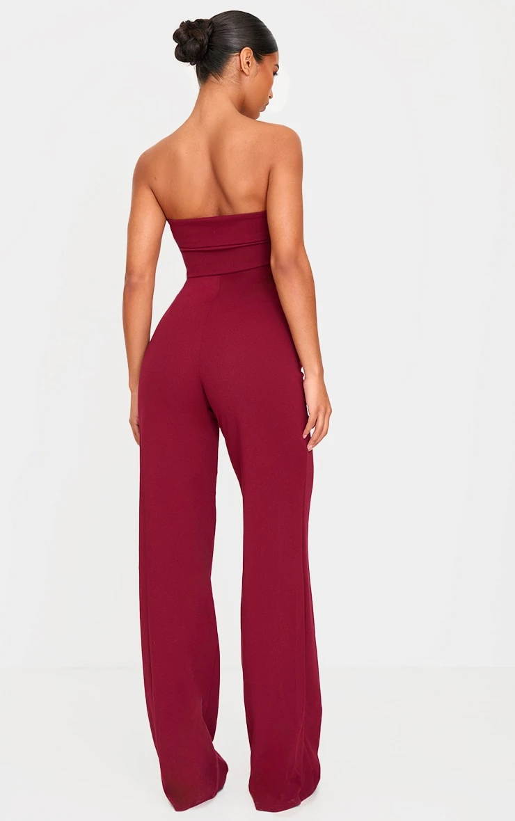 Introducing classy silhouettes with this burgundy crepe fold over detail wide leg jumpsuit. Made from a burgundy hue crepe material with a fold over detail and wide leg design, this jumpsuit is a must have for all those special occasions. Style with point toe heels and simple accessories for a look that won’t go unnoticed.