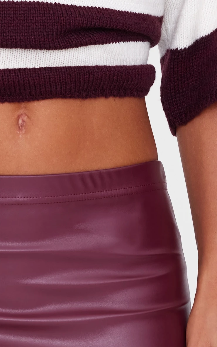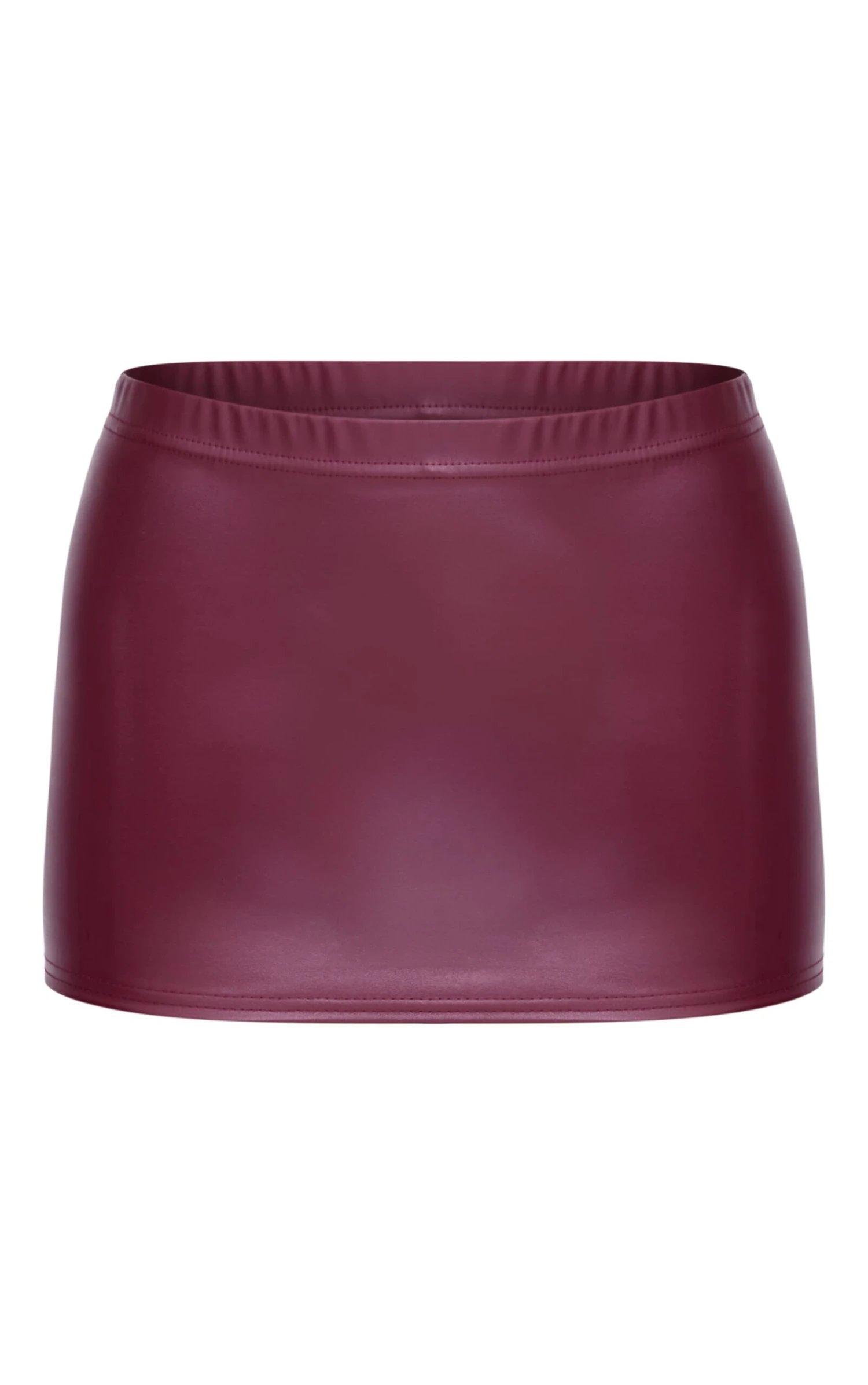 Consider this your style cue: the burgundy faux leather micro mini skirt, a masterclass in after-dark dressing. The high-shine finish of the faux leather gives it an edge, while the rich burgundy hue offers an injection of color to your capsule wardrobe. Cut to a micro mini length, this skirt sits high on the waist, creating a streamlined silhouette. Style it with a sheer black top and chunky boots for a considered take on eveningwear, or, for a more daytime aesthetic, try pairing with a roll neck knit and opaque tights.