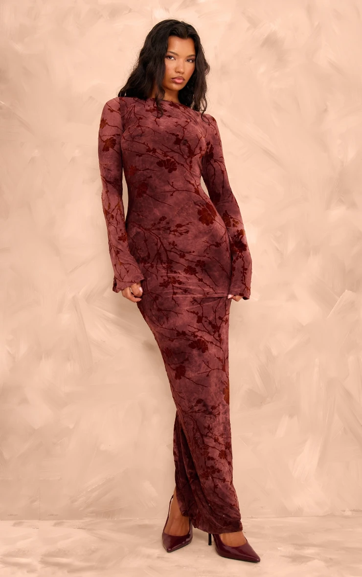 Feel feminine in this burgundy floral devore long sleeve maxi dress. Crafted from burgundy toned fabric with floral detailing, it has long sleeves and a maxi length fit. Wear it with pointed toe heels and subtle jewelry for a flawless finish.