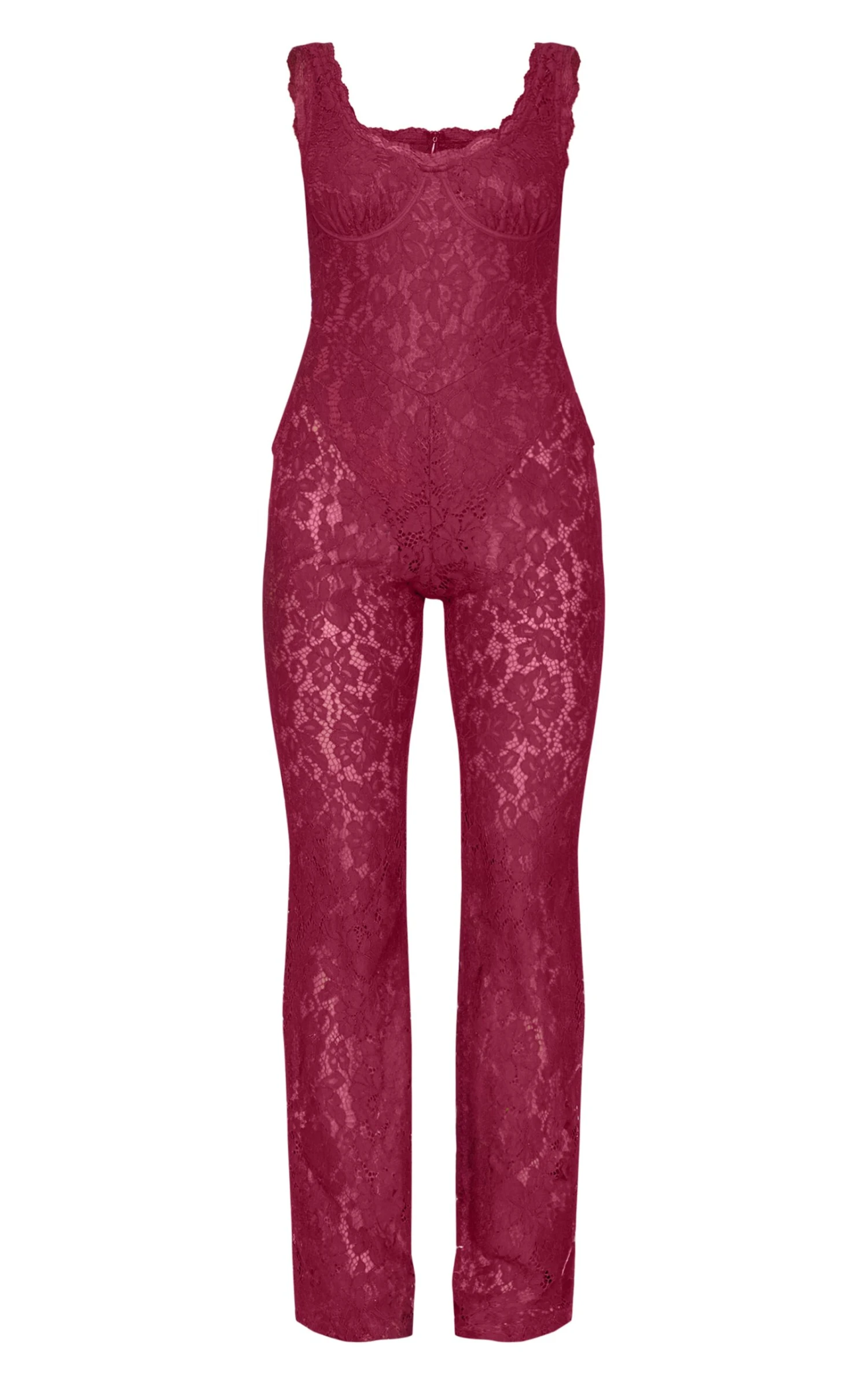 Consider this your after-dark style blueprint. This burgundy lace jumpsuit elevates the standard evening silhouette with considered details. The intricate lace overlay offers a delicate counterpoint to the architectural boning, sculpting the bodice with a refined edge. Thin straps frame the décolletage, while the flared leg creates a lengthening effect. Accessorise with a sculptural clutch from our accessories collection to complete a truly modern after-hours statement.