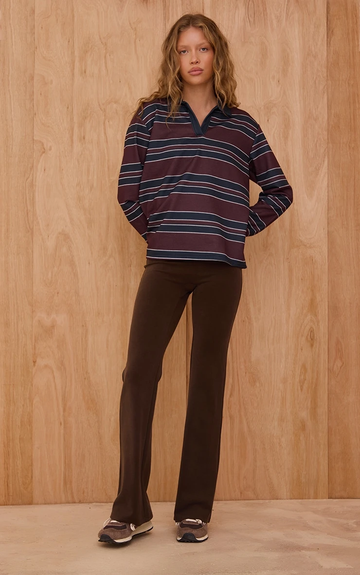 The burgundy stripe cotton polo rugby top blends sporty charm with a touch of retro appeal. Crafted in soft cotton with a relaxed fit, it’s ideal for laid-back days. Style with jeans and sneakers for an off-duty vibe or tuck into a mini skirt with boots for a playful, preppy look.