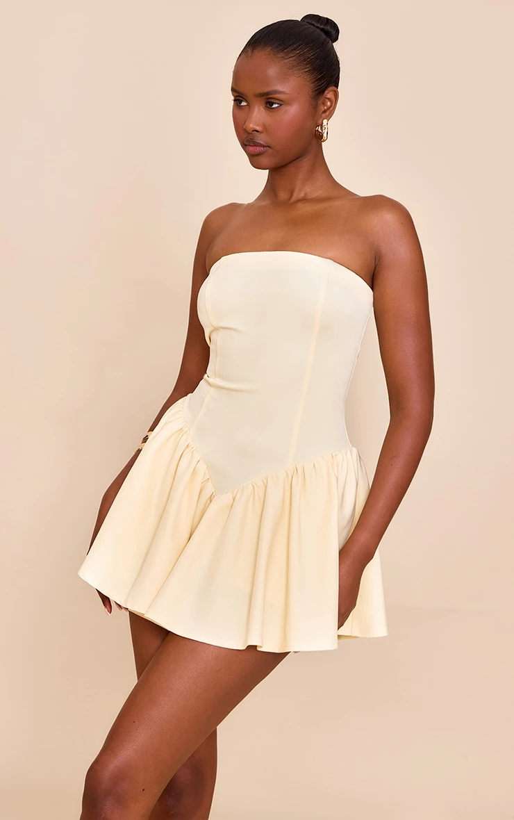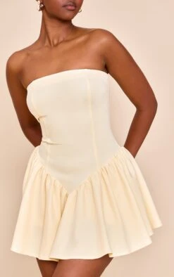 Level up your look in this butter yellow woven bandeau dropped waist romper. Tailored with a strapless design, this romper has a flowy hem with a fitted bodice. Style it with tonal stiletto heels, a gold arm cuff and a sleek shoulder bag for the perfect feminine event look.
