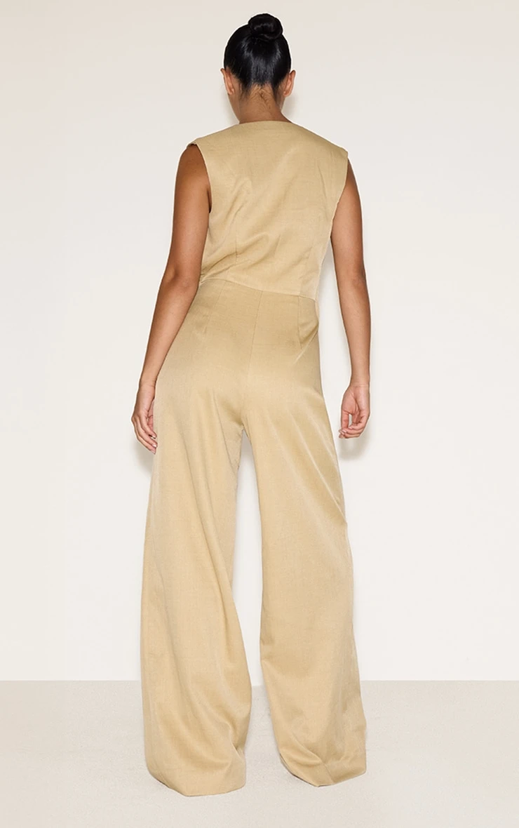 Channel modern tailoring with the camel woven tailored asymmetric vest jumpsuit. Designed in camel woven fabric with an asymmetric vest bodice and a streamlined fit, it brings sophistication to occasion dressing. Team with pointed slip‑on heels and a refined chain‑strap bag for an effortlessly chic look.