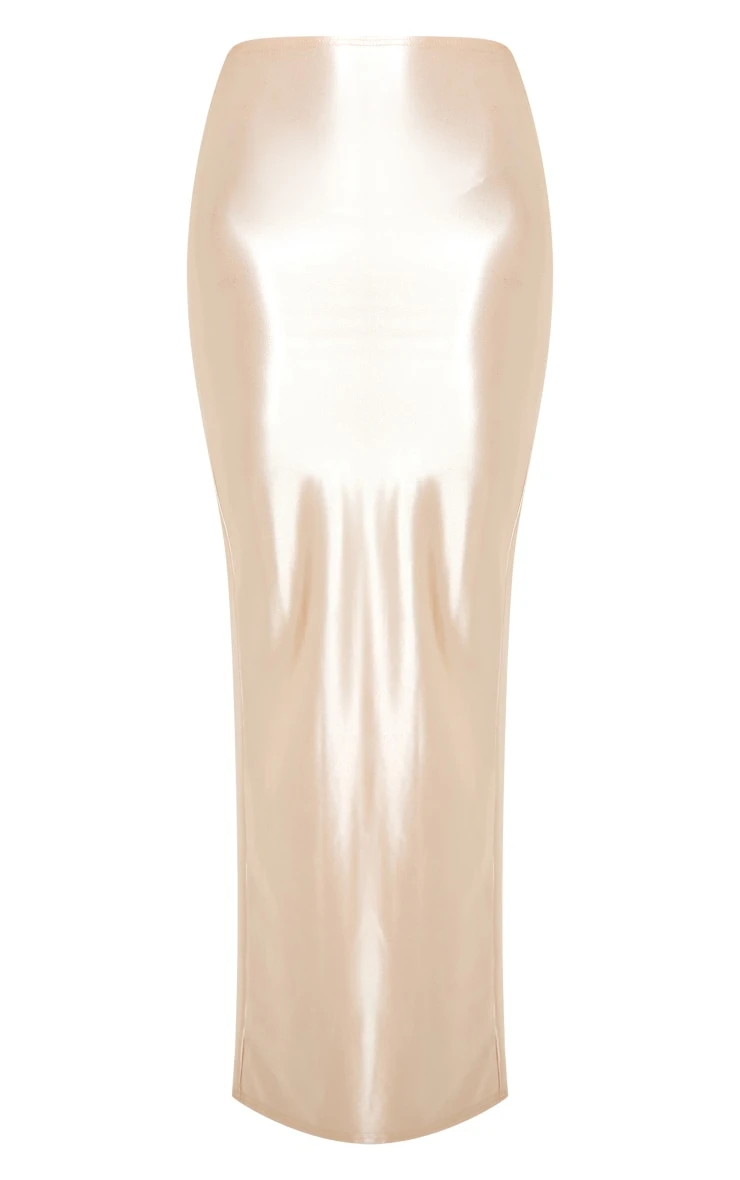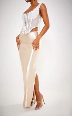 This champagne stretch satin split side maxi skirt is sure to give your weekend look a subtle touch of luxe. Made from a champagne hue stretch satin material with a split side design and a figure-worshipping maxi length, how can you not fall in love? Style this maxi skirt effortlessly with a flattering corset top, heels and a mini bag for a look that is sure to help you gain all the compliments no matter what your weekend plans.
