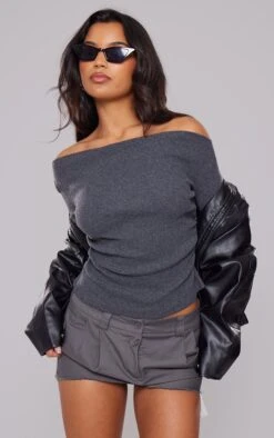 Get ready to enter the new season in style with this charcoal brushed rib bardot long sleeved top. Brought to you in a charcoal brushed rib material with a bardot neckline and long sleeves, what more could you want? Style this bardot top with a mini skirt, chunky boots and a faux leather jacket for an effortlessly chic look we’re loving.