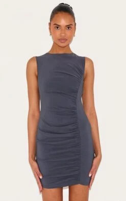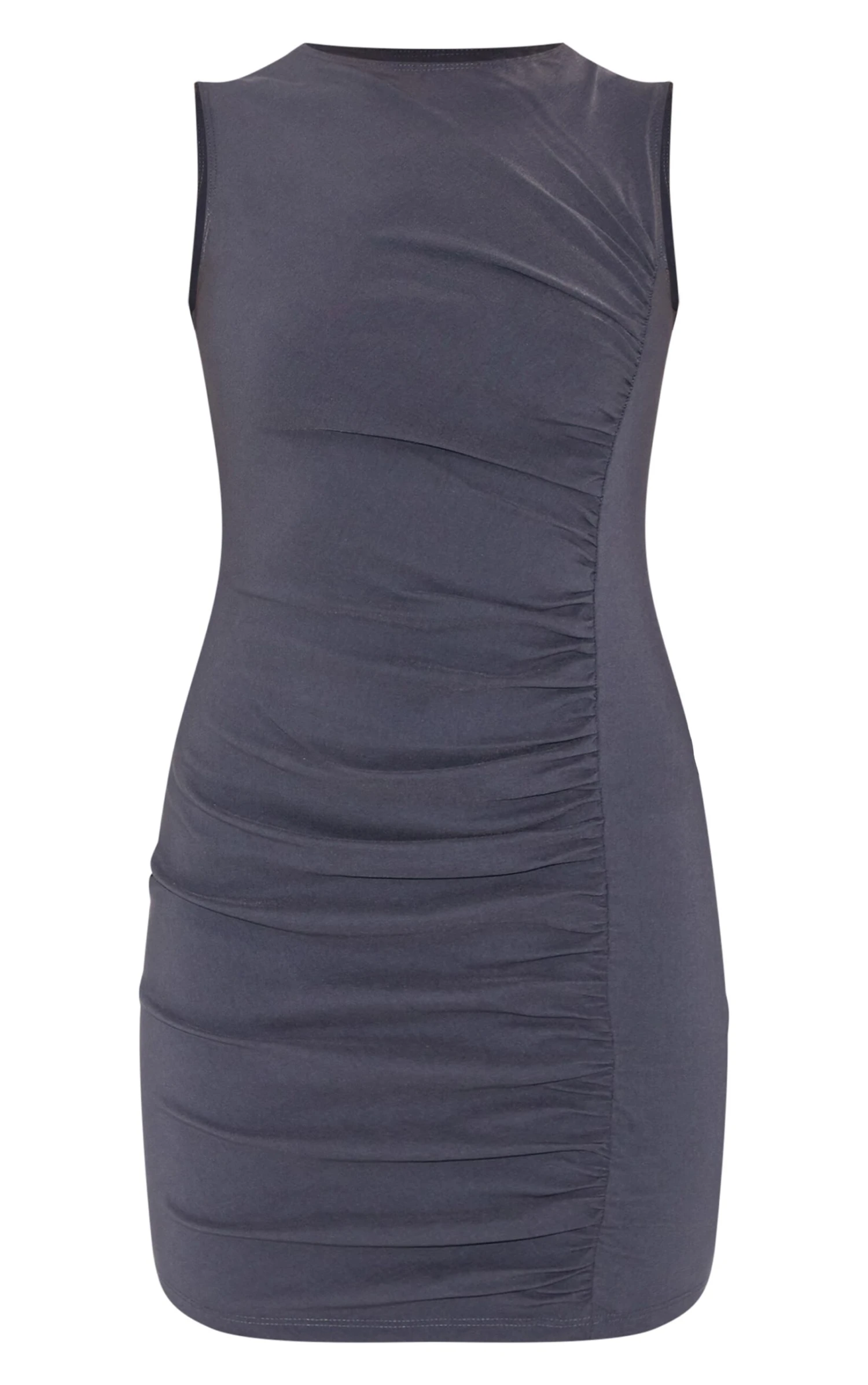 The architect of your after-dark aesthetic. This charcoal bodycon dress is cut from a stretch woven fabric that gently sculpts the silhouette, while considered ruching adds subtle dimension and flatters the form. The muted charcoal hue allows for effortless versatility, lending itself to both minimal and maximalist styling choices. Ground this piece with a sculptural heel and elevate with a delicate chain necklace from our jewelry collection for a considered take on evening dressing.