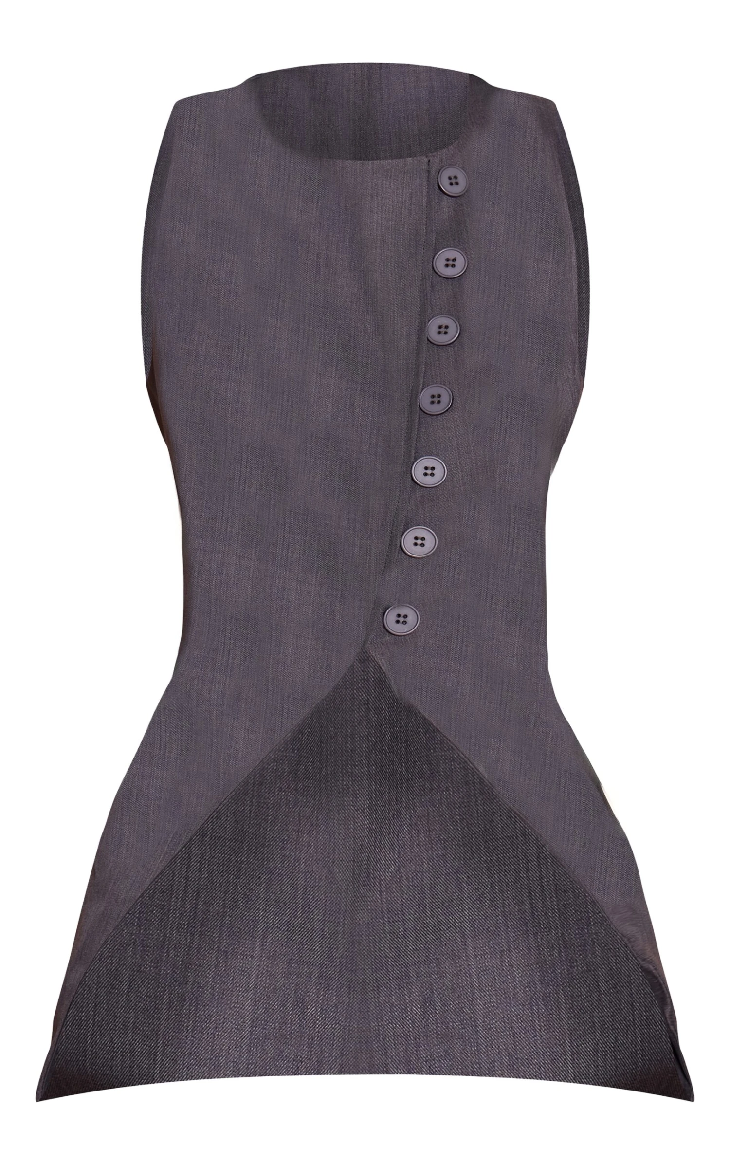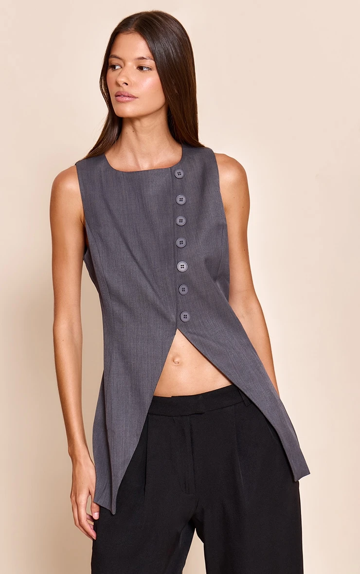 Smart meets contemporary in the charcoal woven asymmetric vest. Tailored with a twist, this sleeveless piece features an off-center value design for a directional edge. Wear solo or over a crisp shirt for a sharp layered outfit.