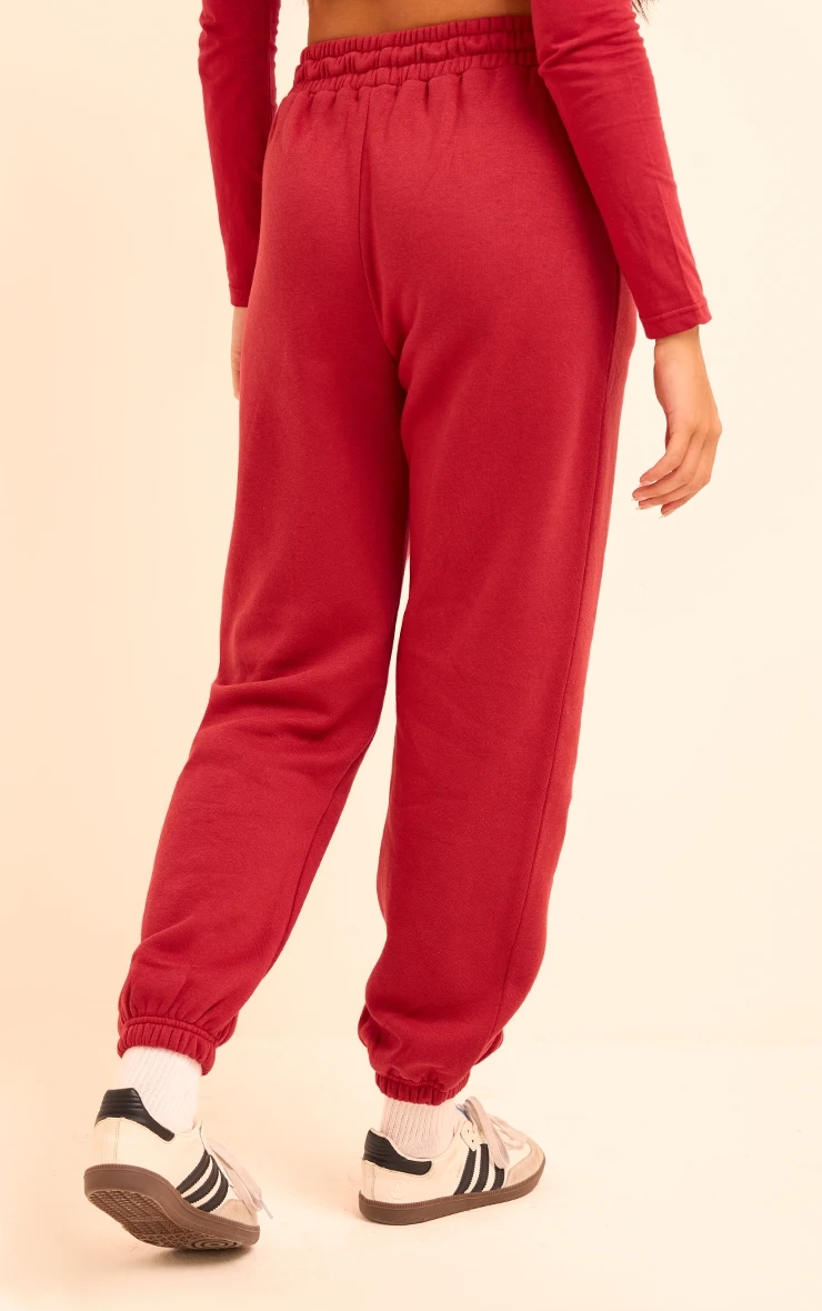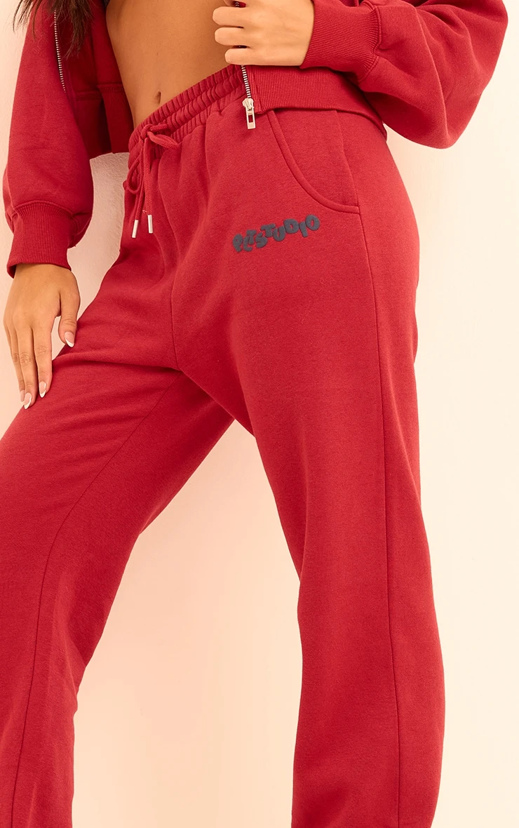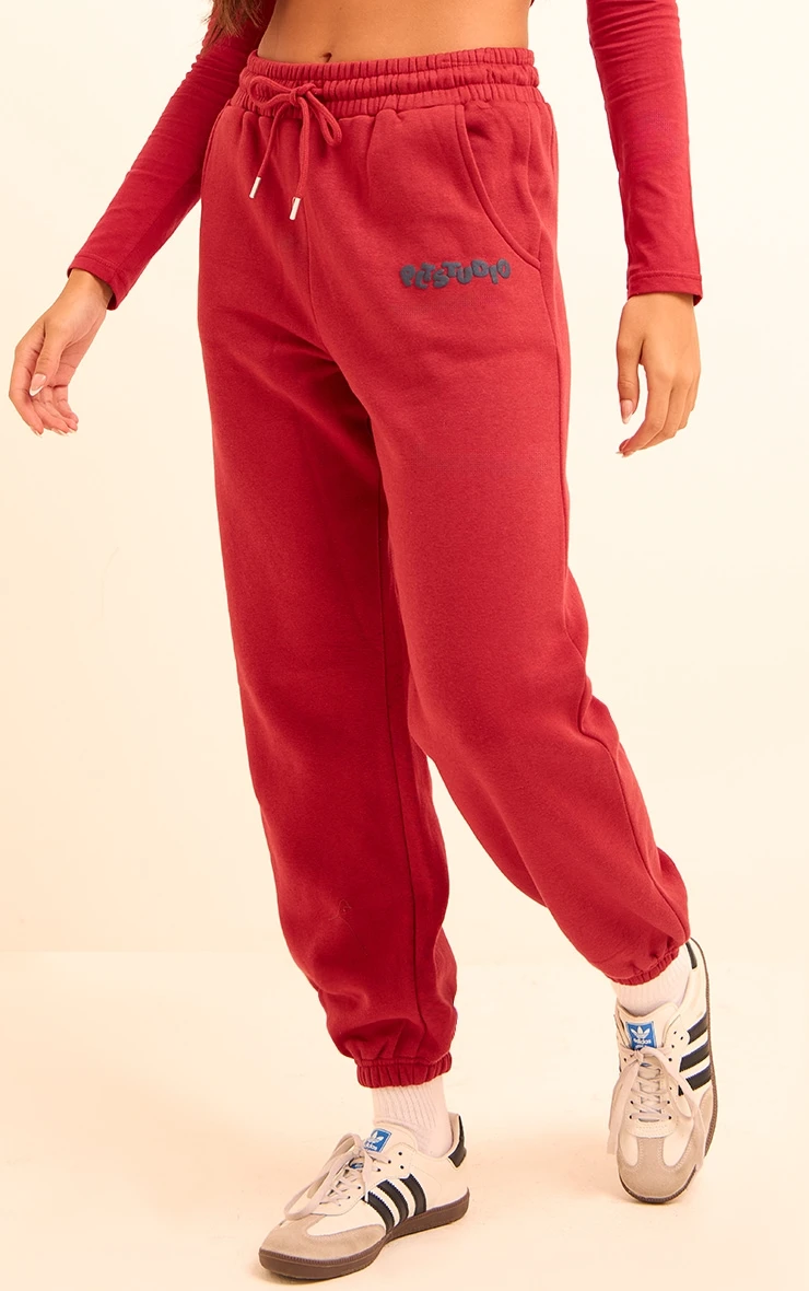 Elevate your off-duty aesthetic with these cherry red sweatpants, a considered take on modern comfort. Crafted in a rich cherry red hue, the design features a subtle PLT Studio puff print, offering a textural contrast. The drawstring waist provides a customisable fit, whilst the cuffed leg lends a streamlined silhouette. Style yours with a ribbed knit top and chunky sneakers for a nonchalant weekend mood, or team with a tailored blazer for a high-low moment. Consider offsetting the relaxed feel with a pair of structured pants from our edit of bottoms for alternative styling options.