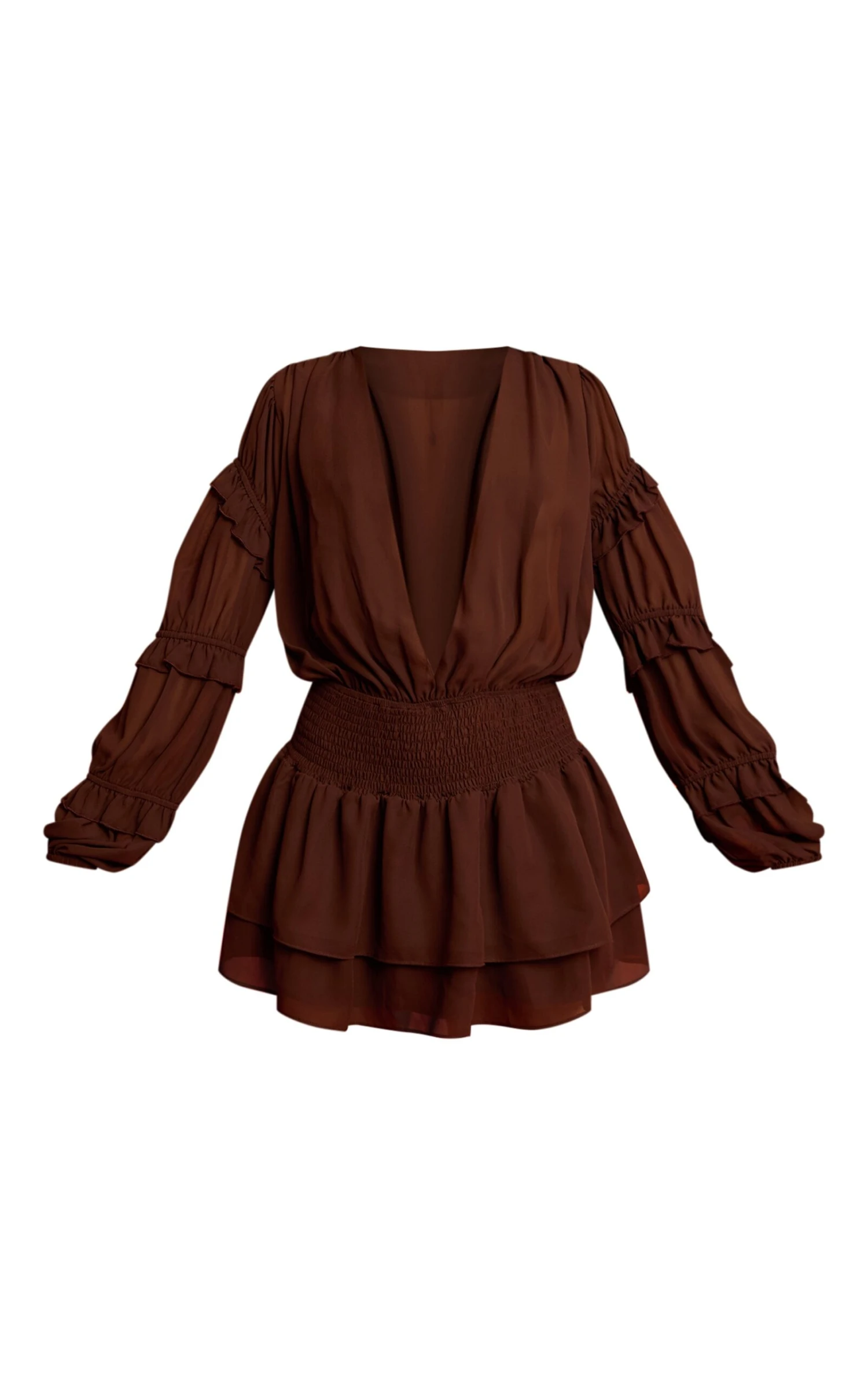 The chocolate chiffon ruched ruffle mini dress is an ultra-feminine piece that brings a romantic twist to your evening wardrobe. Designed with a flattering ruched bodice, this mini dress hugs your shape while the soft chiffon fabric flows beautifully with every step. Cascading ruffle details along the hem and neckline add flirty movement and a touch of vintage charm, making it ideal for dressy occasions. Style with strappy nude heels, gold hoop earrings, and a chocolate-toned mini bag for a chic, coordinated look that’s perfect for cocktails or a romantic date night.