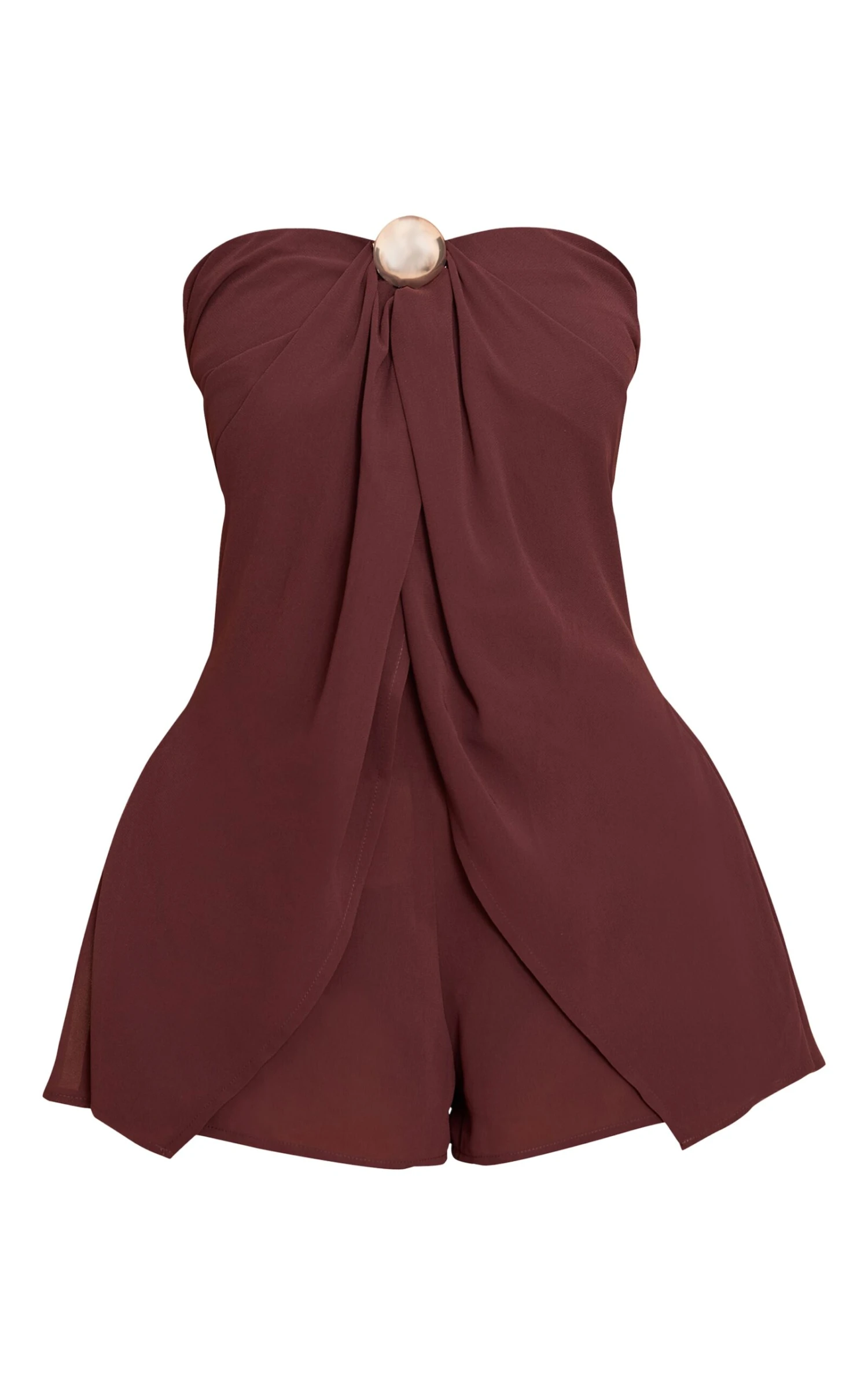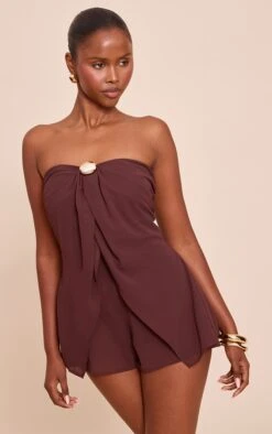 Step into effortless elegance with the chocolate chiffon trim detail bandeau romper. Made from a chocolate chiffon blend material, this romper features a bandeau neckline and delicate trim detailing for a soft, feminine finish. Pair with slip-on heels and gold accessories for a polished occasion-ready look.