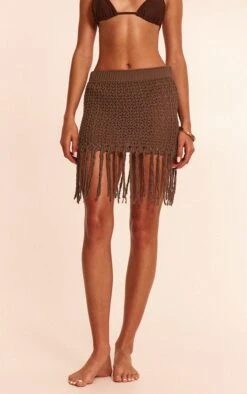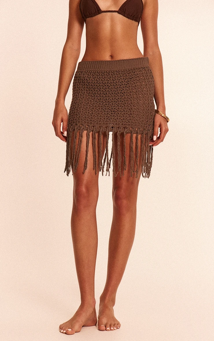 Turn heads this season in this chocolate crochet knit tassel mini skirt. Crafted from a deep brown crochet material, this skirt has unique tassel embellishments and a mini length fit. Add it to your favorite bikini, sleek stiletto heels and your gold earrings of choice for a look we love.