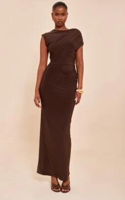 Exude glamour in this chocolate double layer slinky off shoulder drape maxi dress. With elaborate asymmetrical shoulder draping, this dress has a bodycon fit with waist ruching. Simply style it with neutral toned heels, a chunky gold bangle and simplistic god stud fastening earrings for an elevated finish.