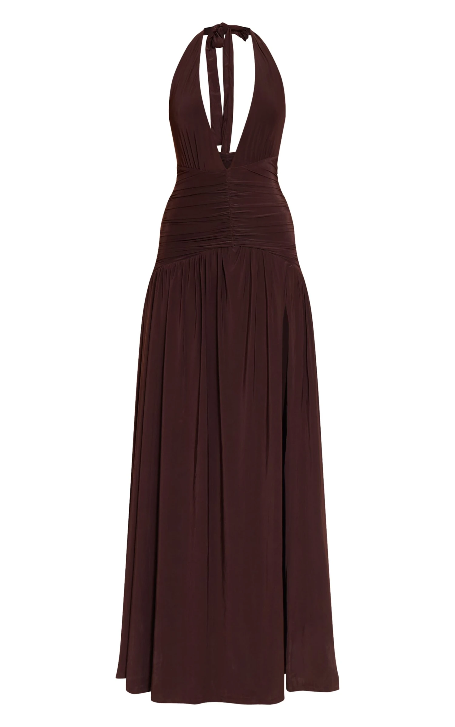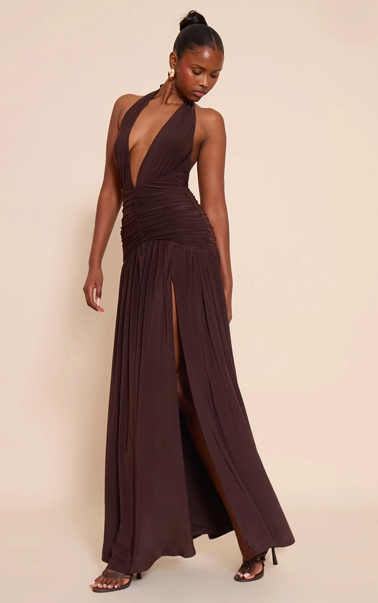 Channel pure after-dark confidence. The chocolate double layer slinky ruched detail maxi delivers a masterclass in modern evening wear. Its deep halter neckline and expert ruching sculpt a captivating bodycon silhouette, while the dramatic high split ensures an unforgettable entrance. The rich chocolate hue adds depth. Pair it with sharp heeled mules and a sleek gold-tone clutch, ensuring your presence is felt.
