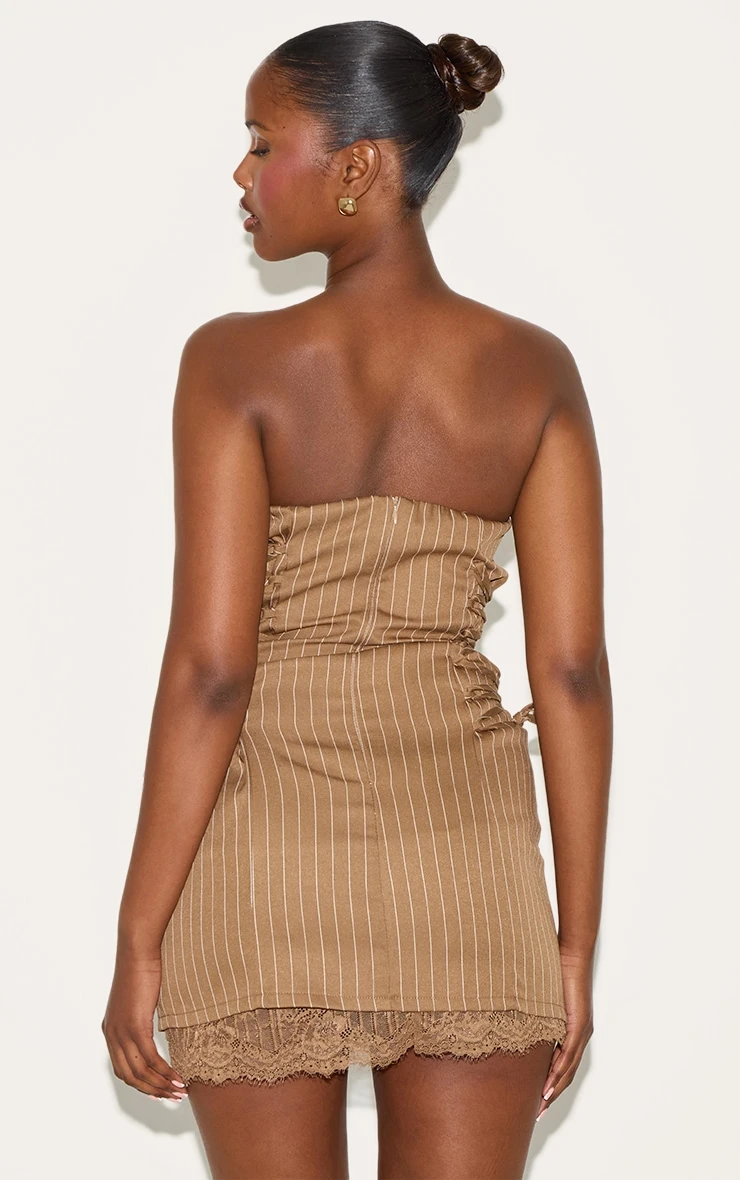 Crafted from chocolate pinstripe material with a bandeau top and lace trim shift detailing. To take your look to the next level, team this chocolate pinstripe bandeau lace trim shift dress with an understated pair of strappy stiletto heels and statement gold jewelry.