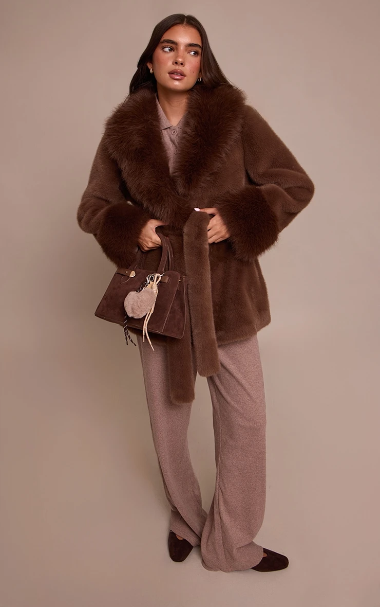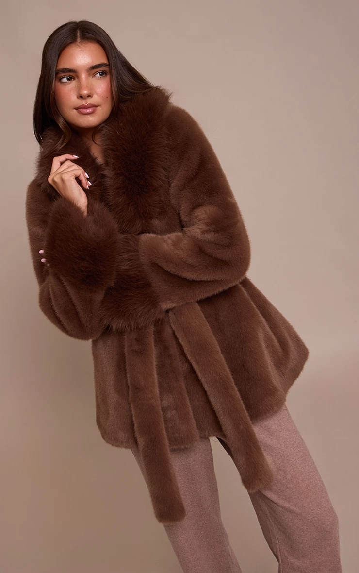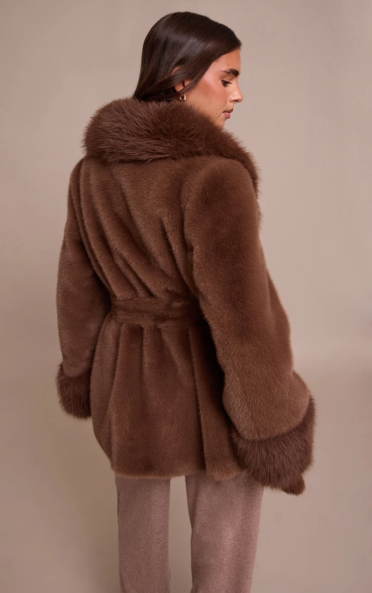 Channel timeless glamour in the chocolate plush faux fur self tie coat. Crafted in ultra-soft plush faux fur in a chocolate hue, this coat is designed with a self-tie waist belt for a flattering fit and an opulent feel. Layer over an evening dress or tailored separates for a luxe finishing touch.