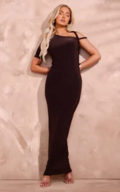 Discover elevated minimalism with this chocolate slinky midaxi dress. Cut from a subtly shimmering fabric that drapes beautifully, the design features an artful twist detail at the shoulder, lending a considered edge to the streamlined silhouette. The rich chocolate hue offers versatility, ideal for after-dark moments. Style with delicate gold hoops from our jewelry collection to complete the look.