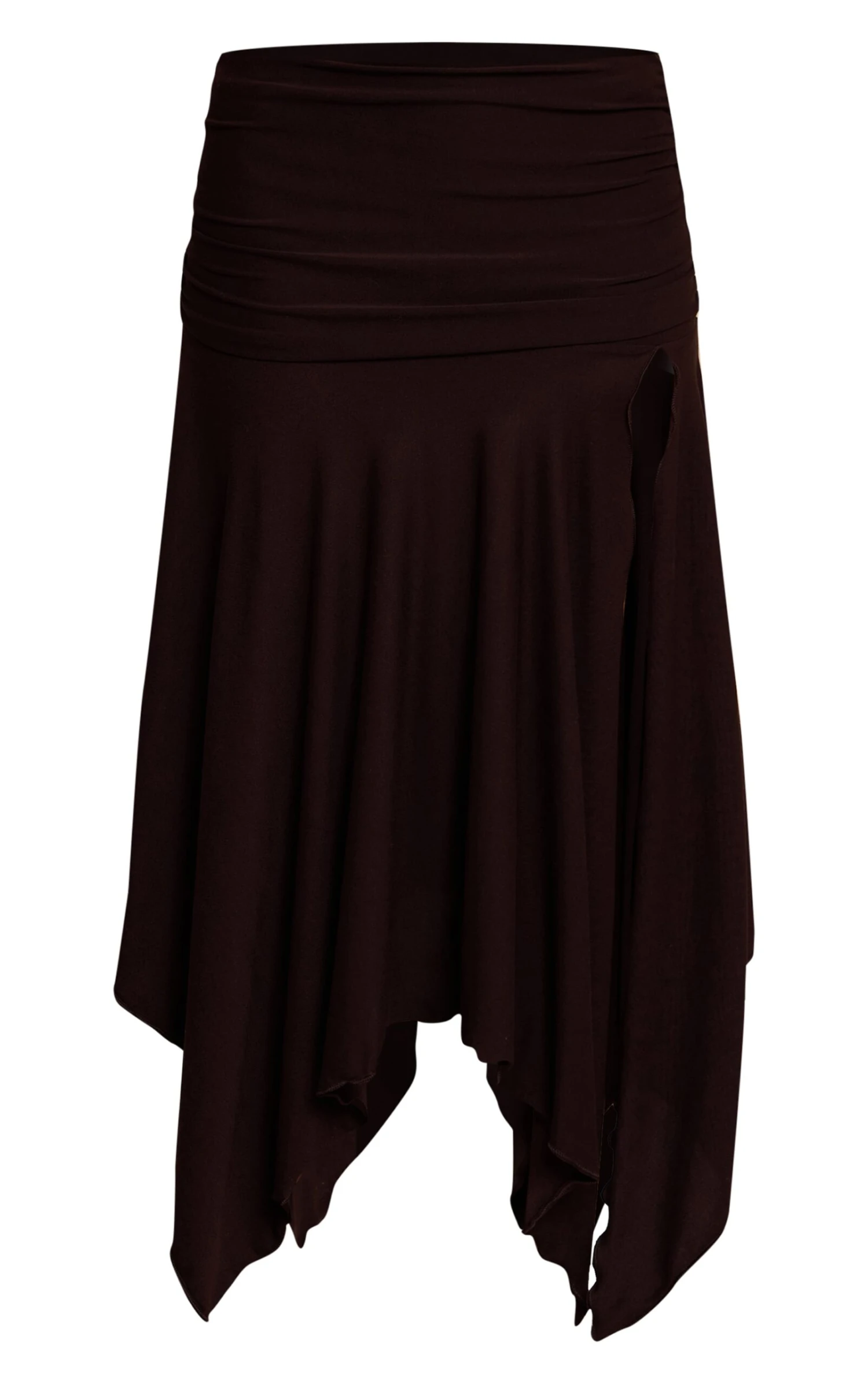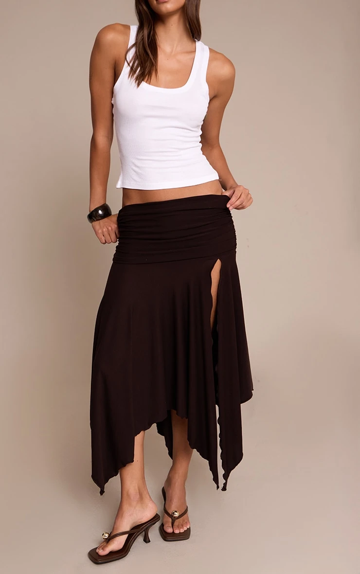 Unveil confident lines and artful motion. The chocolate soft touch ruched asymmetric midi skirt carves a distinctive silhouette, featuring an expertly ruched waistband that introduces textural depth before flowing into a midi length, defined by its striking asymmetric hem and an audacious high split. This piece ensures an impactful presence, moving with inherent ease. Pair yours with a sleek black bandeau top and sharp brown heels, elevating the ensemble with a structured black bag for an assured after-dark statement that commands attention.