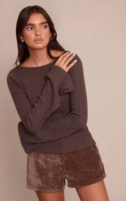 Keep it sleek with the chocolate thick brushed rib flared long sleeve top. Made from a chocolate thick brushed rib material, it features flared long sleeves, a fitted silhouette, and a flattering stretch finish. Style with slip on mule heels and a clutch bag for timeless chic.
