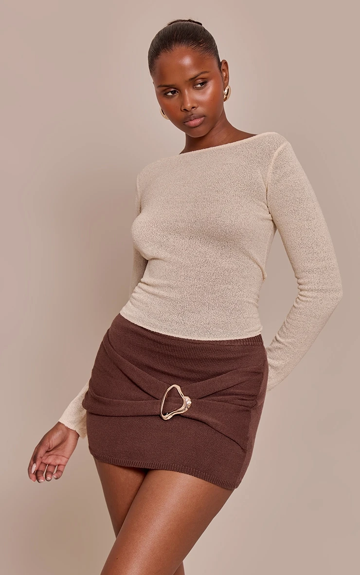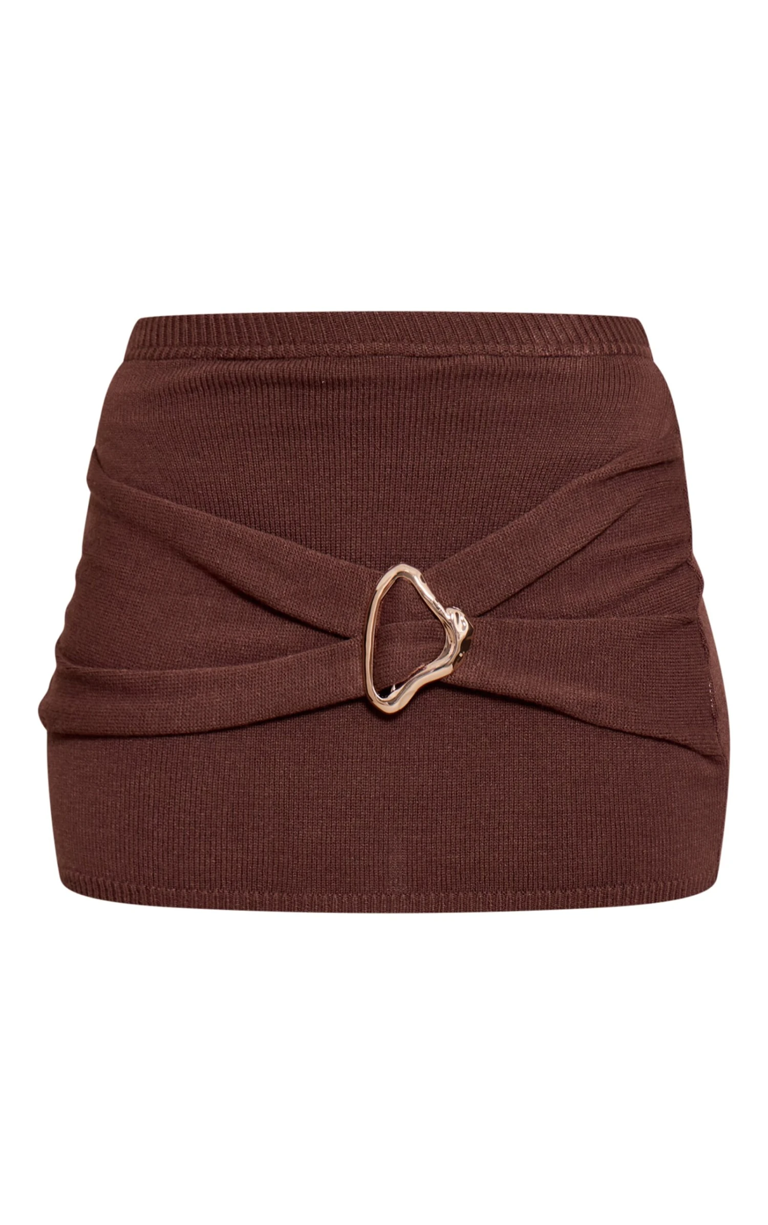 When understated meets unmissable, your evening look takes shape with the chocolate trim detail mini skirt. This confident mini, presented in a rich chocolate hue, features a distinctive gold-toned trim at the front, elegantly gathering the silhouette into an artful drape. Its sharp cut elevates any ensemble, perfectly primed for those after-dark moments. Style this essential with a sleek, long-sleeved knit or a sophisticated bralette, finishing with sharp heels for an evening aesthetic that’s both knowing and effortlessly chic.