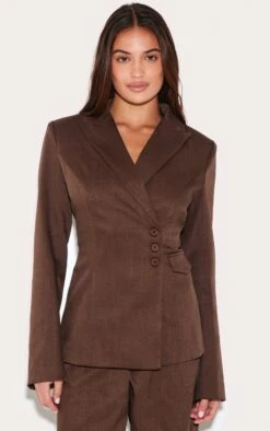 The tailored blazer, reimagined. This chocolate woven blazer offers a masterclass in considered construction. The cinched waist creates a defined silhouette, whilst the rich chocolate hue provides a grounding neutral for your wardrobe. Crafted from a quality woven fabric, this piece promises both structure and comfort. Elevate your everyday by styling it with wide-leg pants from our bottoms collection for a confident power pairing.