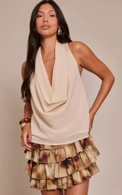 The cream chiffon extreme cowl neck detail long top brings fluidity to occasionwear. Designed with a dramatic draped cowl neckline, it flows into a longline cut crafted from airy chiffon. Its soft cream tone adds timeless sophistication. Style with wide leg pants and gold Jewelry for an elevated evening fit, or wear loosely over a mini skirt for summer sophistication.