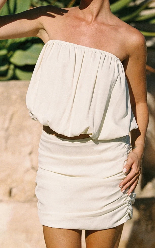 Play with proportions in this cream chiffon ruched drape mini skirt, ideal for elevated warm-weather looks. Brought to you in a cream chiffon fabric with ruched sides and a fluid drape, it flatters and flows. Pair with the coordinating puffball top for a sweet matching set.